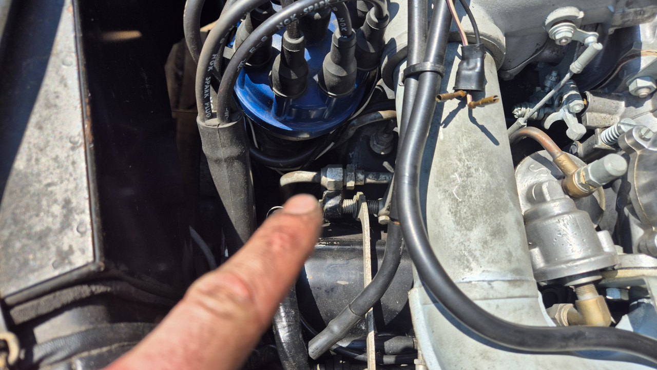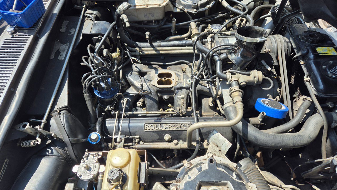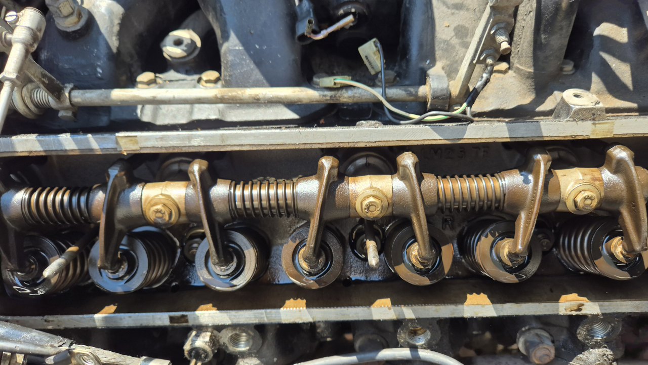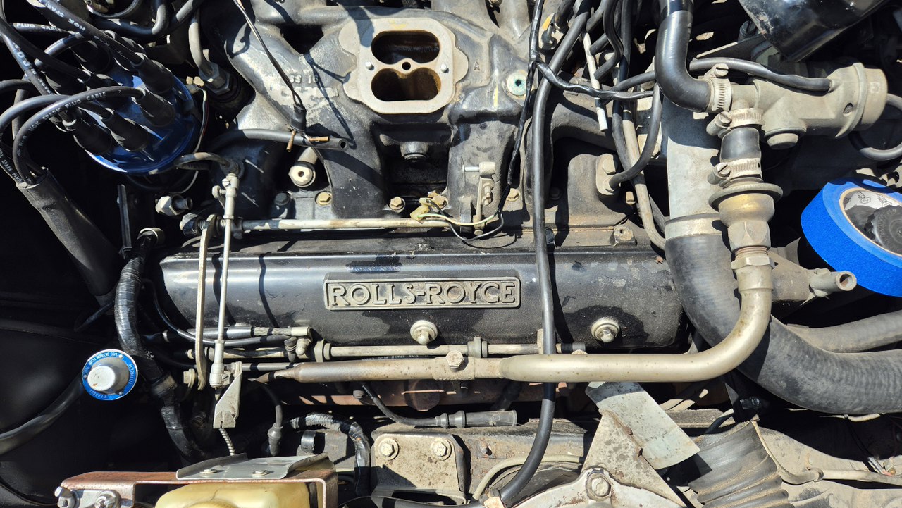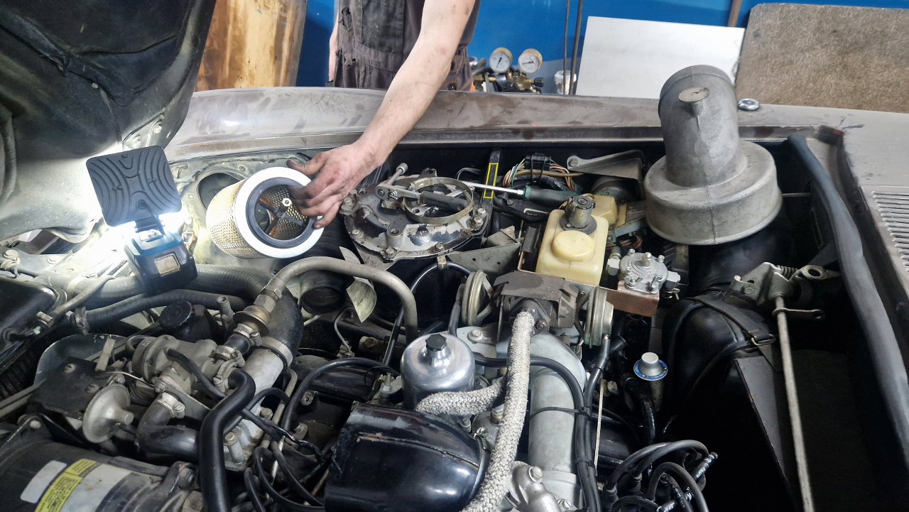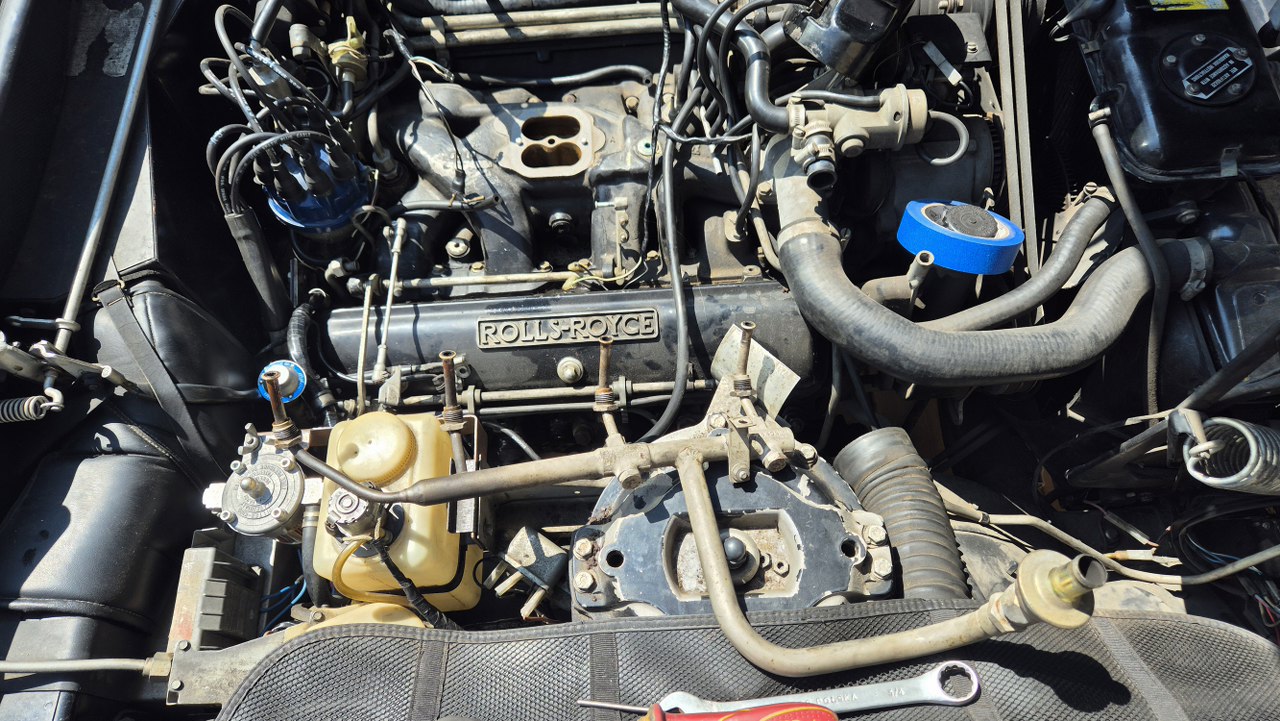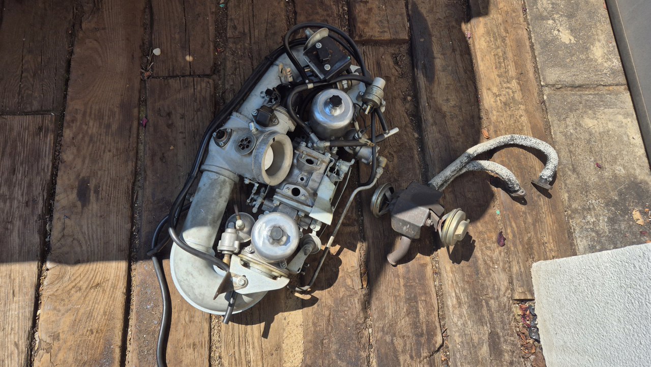 No dobra, to teraz to trudne, czyli dostanie się do pokryw zaworów. Nie ma do nich żadnego dostępu. Muszę zdemontować wszystko to, co jest na górze silnika. Dolot swoją drogą, ale jest to wersja amerykańska, więc ma dowaloną ekologię, która i tak nie działała. Demontowałem to już z amerykanców, nawet widziałem naklejki z epoki, że zdemontowanie instalacji nie powoduje przekroczenia norm emisji spalin, nawet w Kaliforni. Ekologia składa się z układu EGR, to te dwie rurki w oplocie po lewej, podłączone do zaworów sterujących i do wydechu; następnie z pompy powietrza napędzanej paskiem klinowym i dmuchającej te powietrze w kolektory wydechowe w celu rozrzadzenia spalin. To też jest sterowane zaworkami. Zaworki potrzebują podciśnienia, a sygnały strujące biorą z czujników temperatury, których przez to jest całe stado.