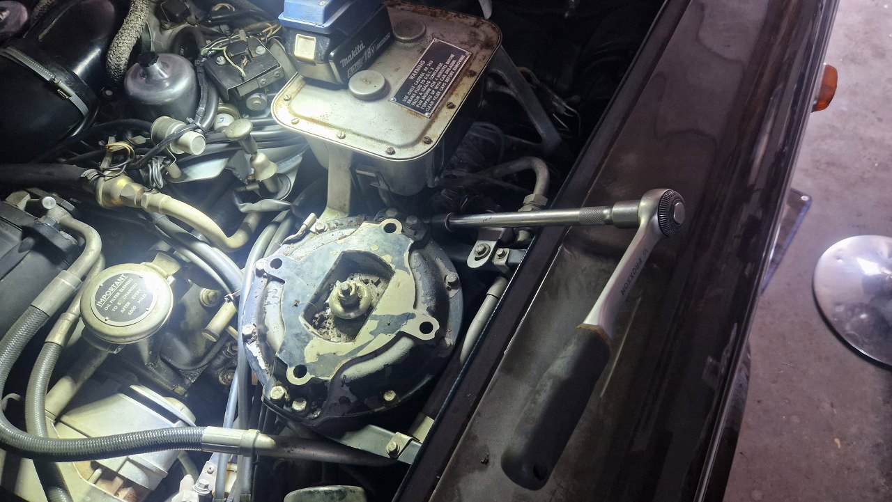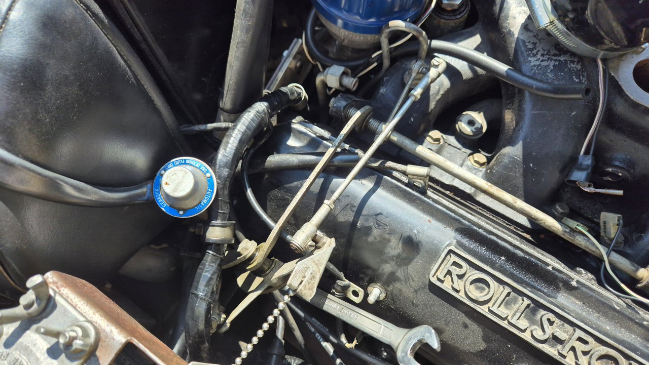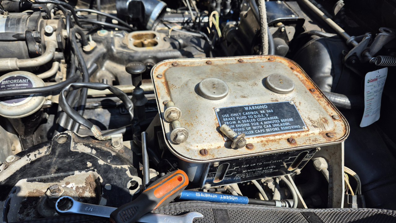 Odkręciłem śrubki mocujące pokrywę i położyłem je na... zbiorniczku na płyn hamulcowy! Tak, tu jest płyn. Co prawda nie tylko do hamulców, ale również do układu hydropneumatyki zawieszenia, wziętej wprost od Citroena. Zbiorniczek wyskalowany jest w... pintach. Dzięki temu łatwo się jest połapać - pinta to pół kwarty, a kwarta to ćwierć galona. Proste.