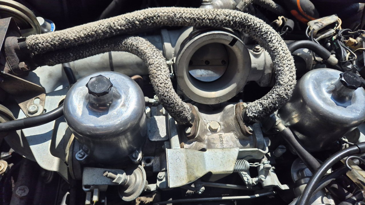 Tuż nad wejściem powietrza z tej gumowej rury jest przykręcona grubsza rurka odmy. Rurka w oplocie idzie z kolektora wydechowego, wydaje mi się, że to ciepłe powietrze grzejące jakiś bimetal w środku, któy działa jako ssanie.