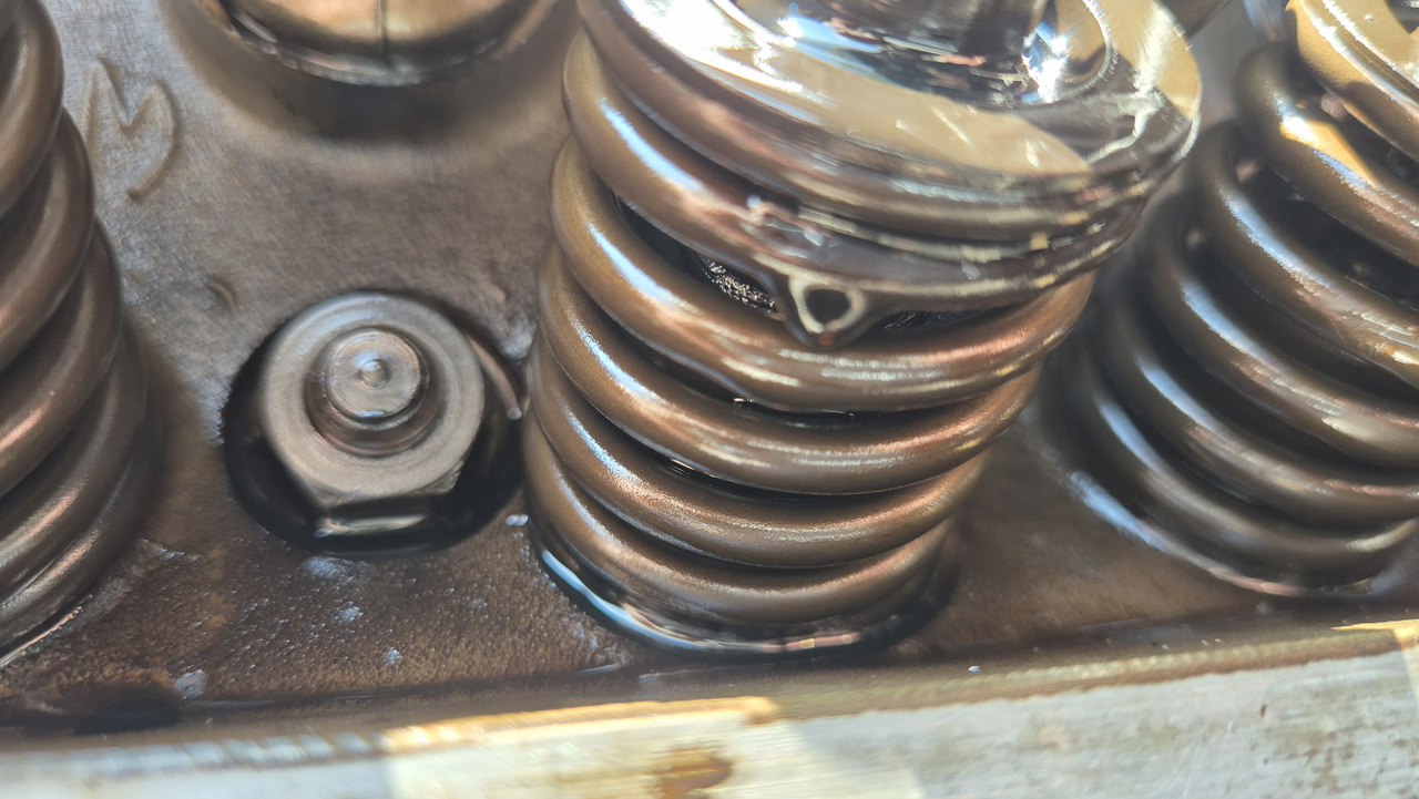 Przez sprężyny nic nie widzę, ale jeśli uszczelniacze byłyby w słabym stanie, raczej by się pokruszyły. Zresztą według katalogu są tu uszczelniacze filcowe. Ponieważ wygląda to dość dobrze, a wymiana uszczelniaczy to kupa pracy, to na razie to odpuszczamy.