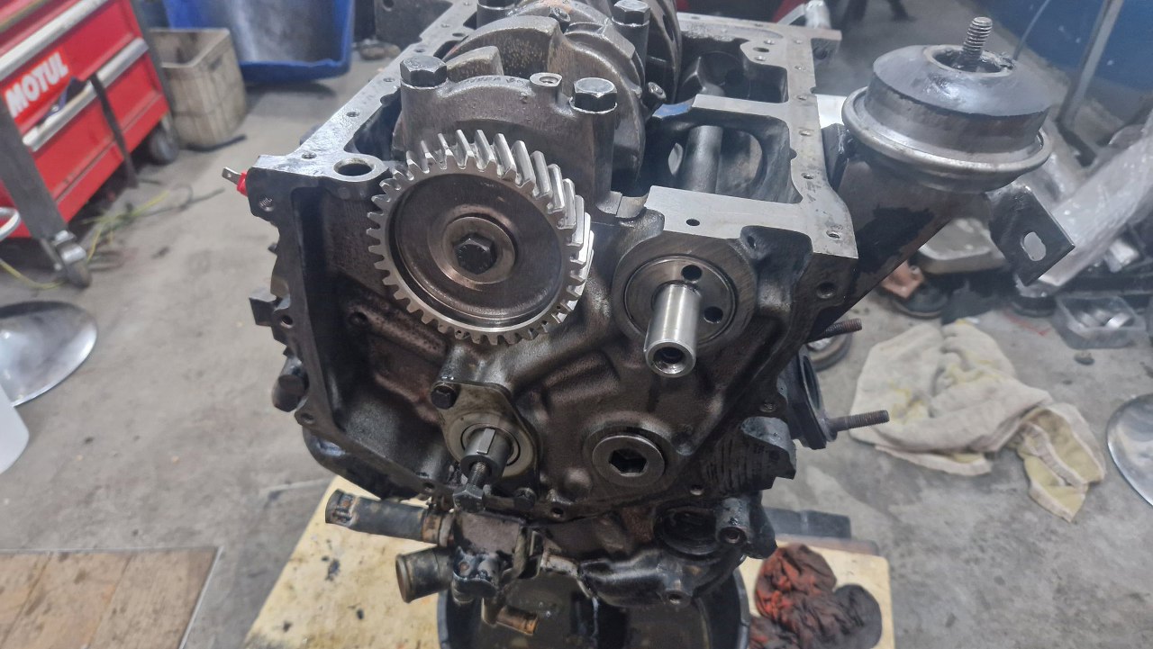 Potem silnik przerzuciłem na stół. Leży do góry nogami, żeby po wyjęciu wałka rorządu nie wypadły popychacze zaworowe. Bo głowic do tej operacji nie ściągam... poziom trudności operacji jest mniej więcej taki, że prawie na to samo by wyszło, jak bym to robił przez rurę wydechową :).