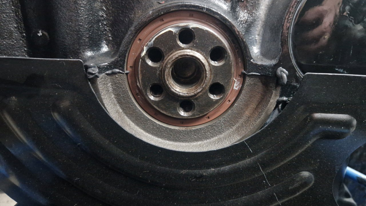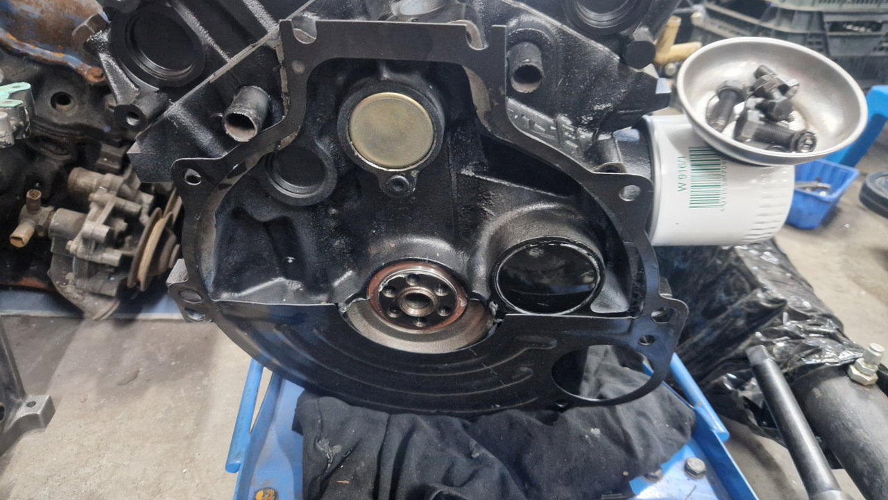 W wale było uszkodzone łożysko prowadzące skrzyni biegów, które wyjąłem. Teraz nie ma tu nic. Muszę pamiętać, żeby zainstalować właściwe, ale to po pomiarach wałka skrzyni u właściciela.