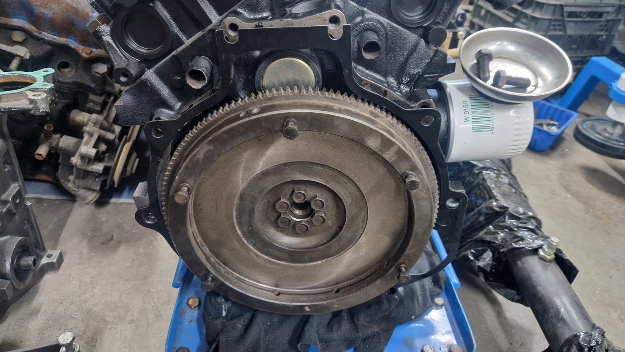 Po założeniu klawiatur i wyregulowaniu zaworów zajmę się kołem zamachowym. Przyłożyłem do bloku blachę oddzielającą silnik od skrzyni biegów.