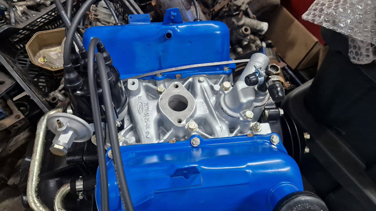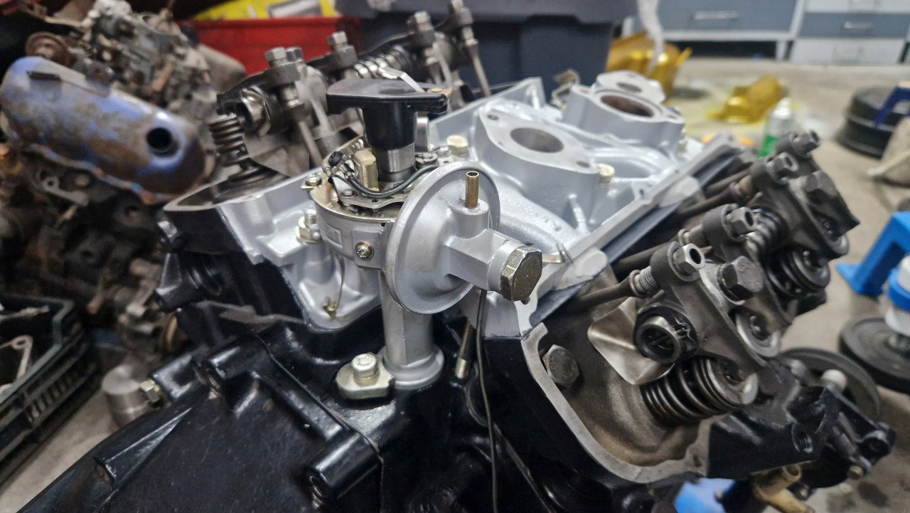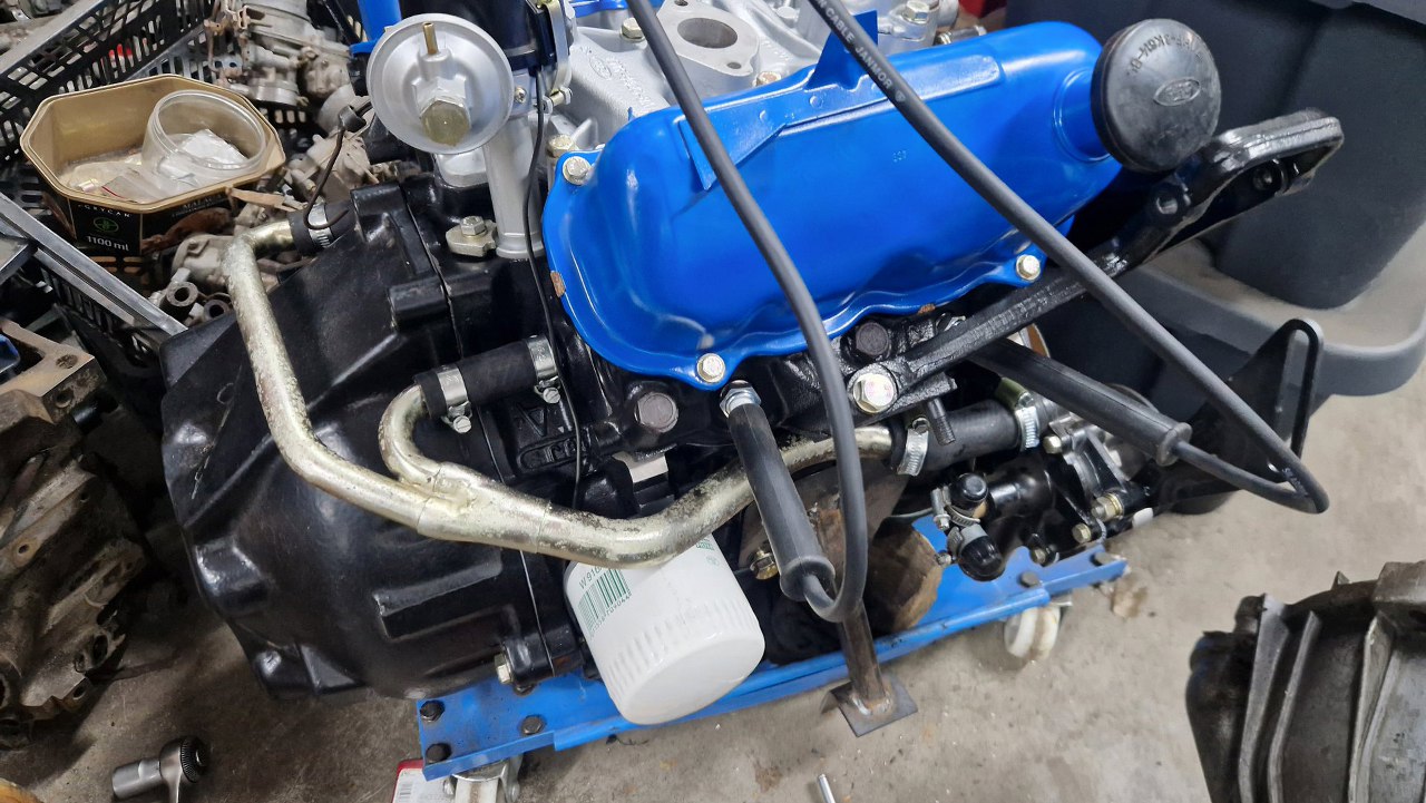 Przygotowując silnik do uruchomienia przykręciłem dzwon skrzyni biegów. Z drugiej strony na miejsce trafił też rozrusznik, ale mam ciasno w garażu i nie miałem jak tam sięgnąć, żeby zrobić zdjęcie :). Kompletuję też układ chłodzenia, czyli główną rurę pomiędzy pompą wody a wyjściami z tyłu bloku. Reszta układu będzie zaślepiona. Założyłem też przewody zapłonowe.
