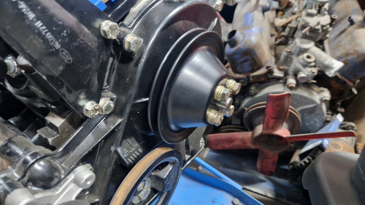Na miejsce trafiło też kółko pasowe. Podkładki pod śruby są zamiast wiatraka chłodnicy, żeby go nie przykręcać. Raz, że niebezpiecznie jest uruchamiać silnik luzem, jak kręci się z przodu wiatrak, dwa, szzkoda by było, gdyby się przypadkiem uszkodził.