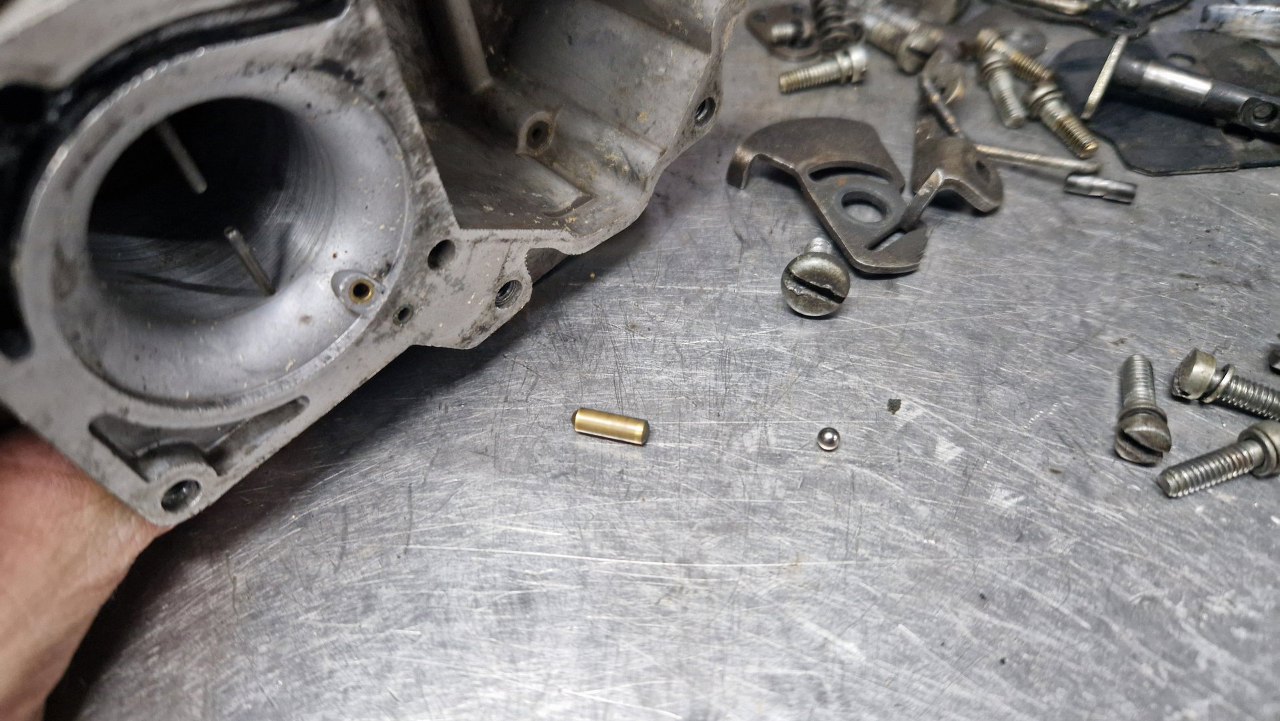 Zaworek składa się z kulki i ciężarka. Zaskoczyło mnie to, że w tym gaźniku były te części, zazwyczaj są zgubione. Z tego zdumienia zaraz później upuściłem kulkę na podłogę...