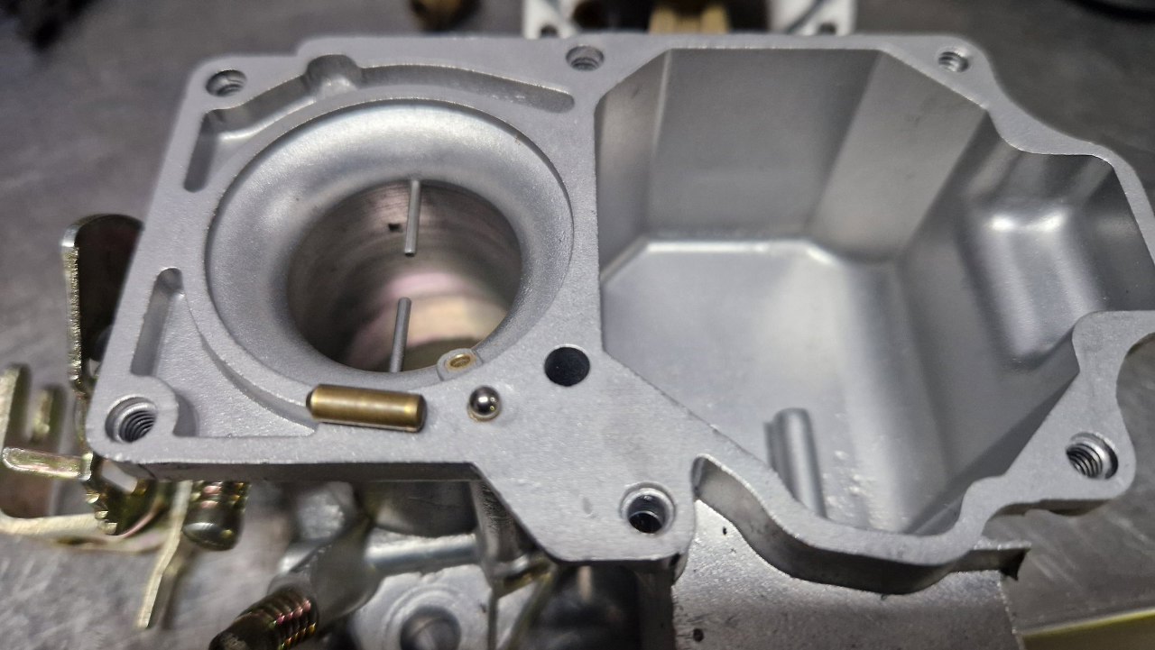 W środku komory pływakowej prawie czysto, jest tu tylko trochę nalotu. W otworze pomiędzy gardzielą a komorą pływakową jest reszta mechanizmu pompki przyśpieszacza, czyli zaworek zwrotny.