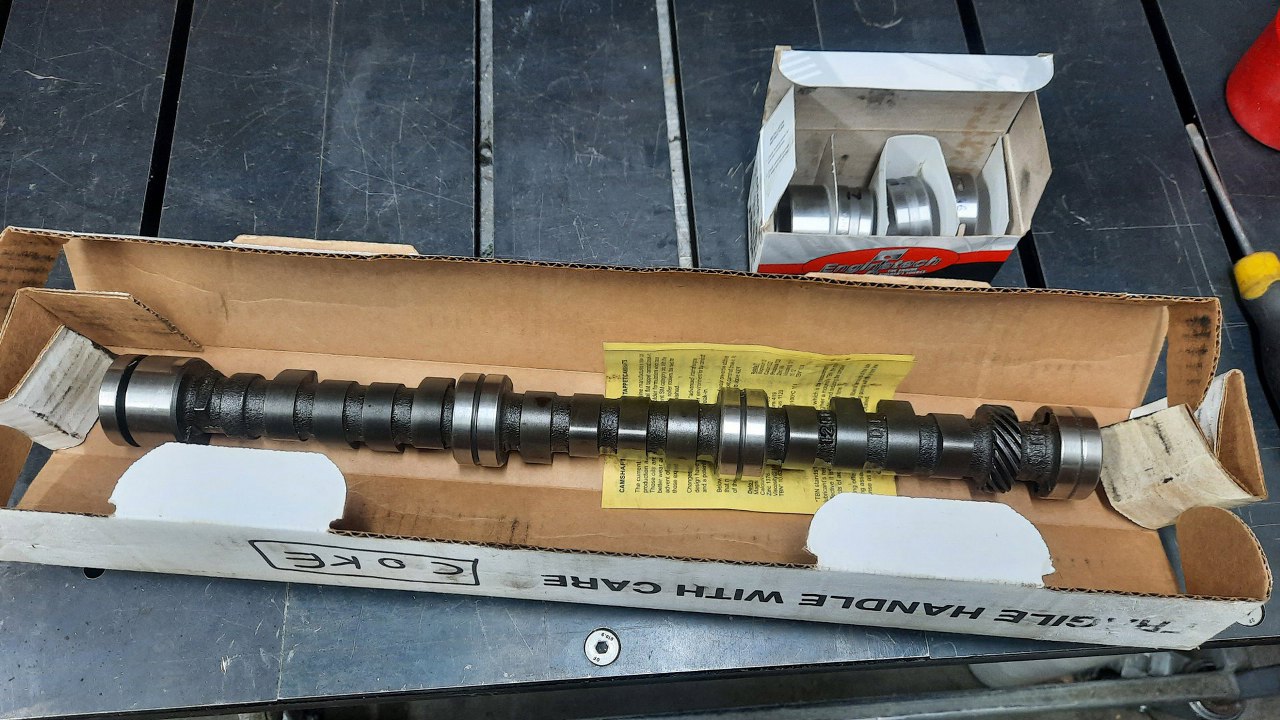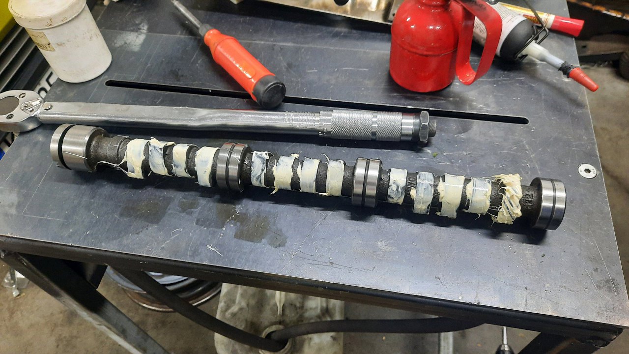 Przy okazji, żeby mi się nie walał po garażu, wkłądam też wałek rozrządu. Krzywki nasmarowałem smarem montażowym Comp Camsa, żeby ułatwić smarowanie popychaczy przy pierwszym uruchomieniu.