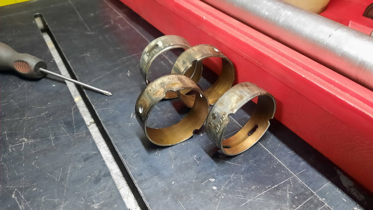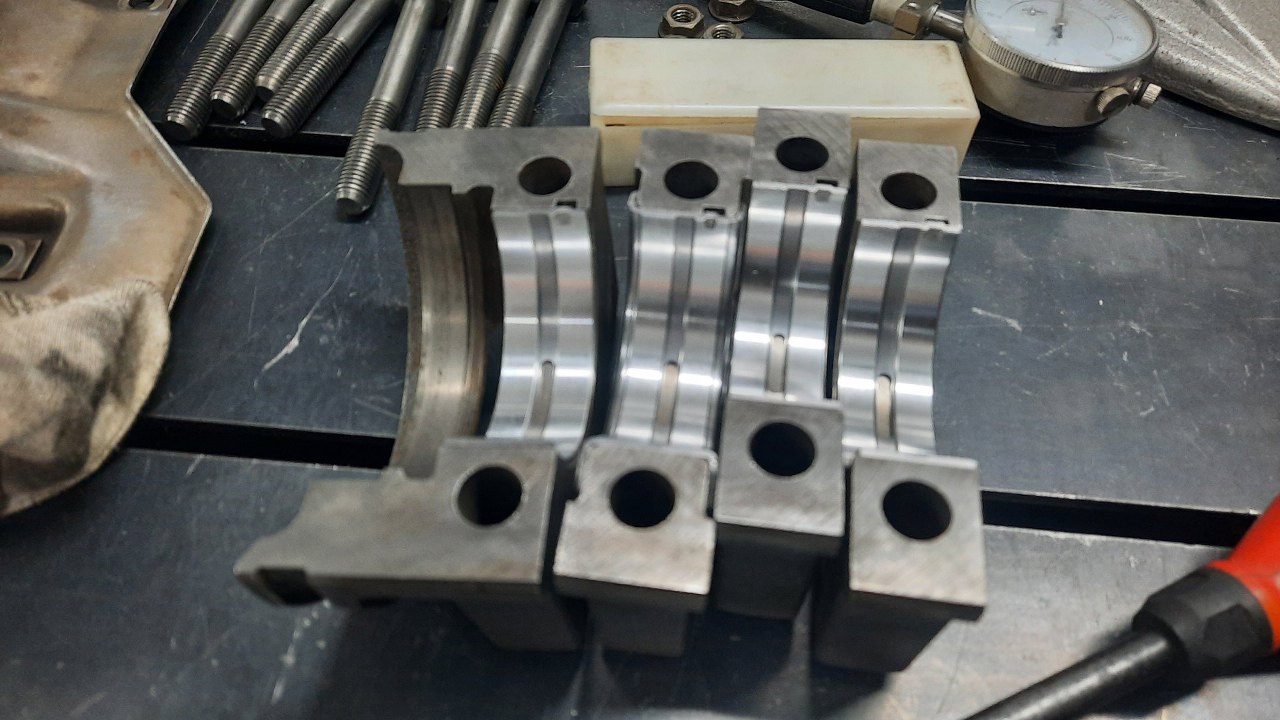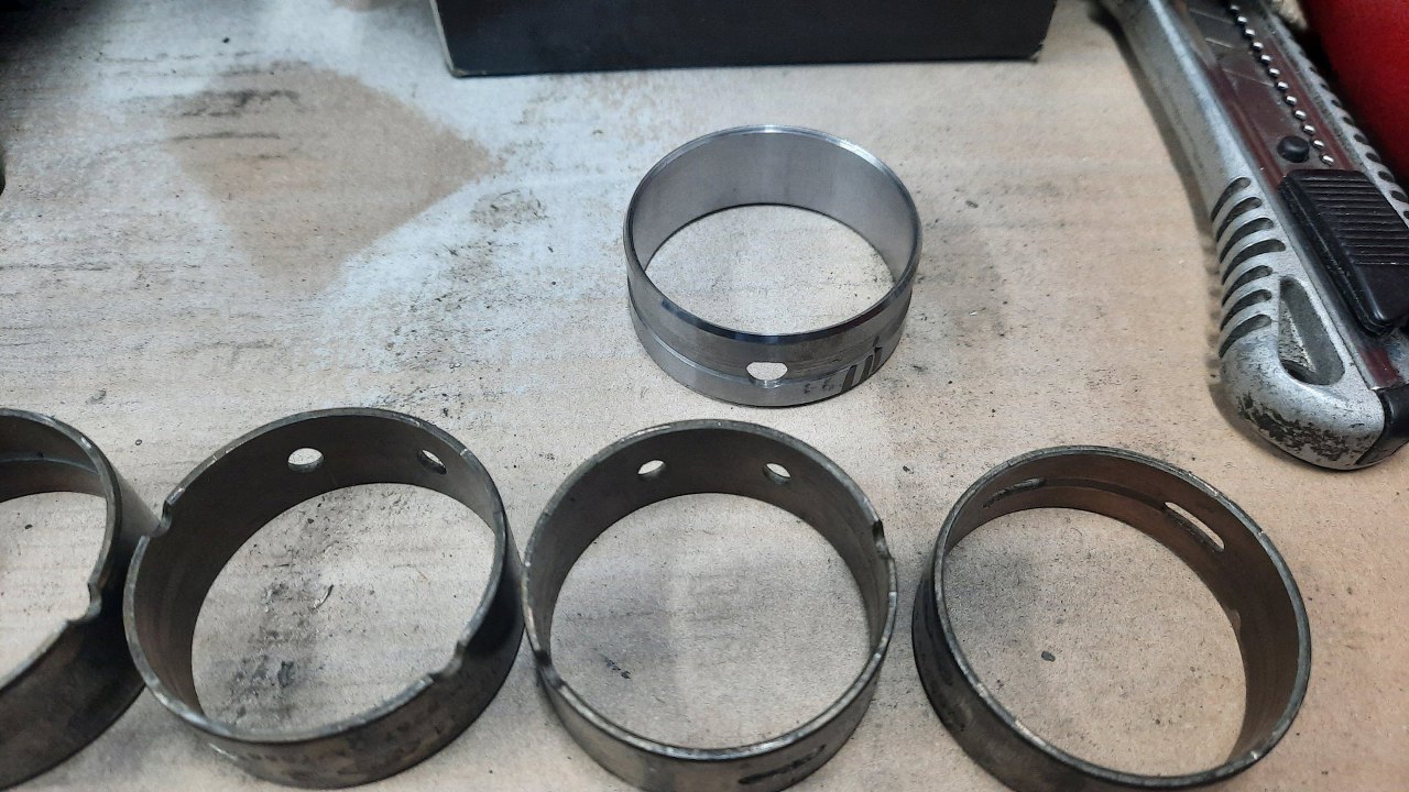 Gdy lakier na bloku już wysechł i stwardniał, znowu zrzuciłem blok na stół warsztatowy, żeby wbić do niego nowe panewki wałka rozrządu. Nowe mają o tyle lepszą konstrukcję, że mają rowki na olej po zewnętrznej stronie, dzięki czemu polepsza się smarowanie góry silnika, czyli dźwigienek zaworowych.