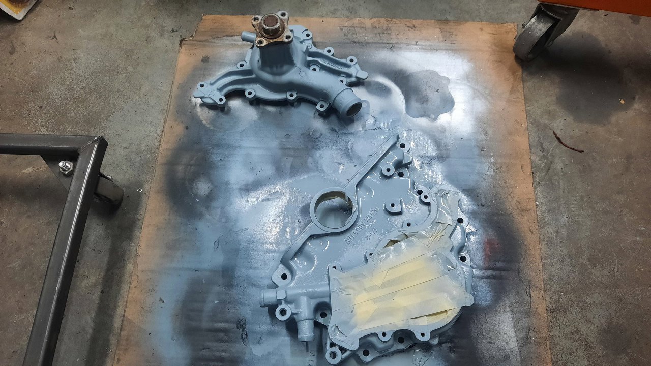 Potem pokrywa i pompa wody (używana, ale w bardzo dobrym stanie, zaryzykujemy jej użycie) też zostały pomalowane podkładem.