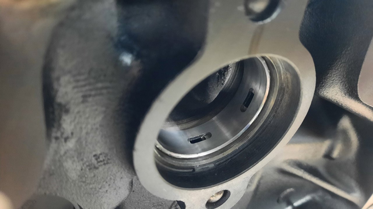 Potem wbijam ją na miejsce przyrządem. Dopiero po wyjęciu przyrządu widać, czy trafiłem otworami panewki na kanały olejowe. Czasem wymaga to kilkunastu podejść, bo wbijam panewkę po kawałku, żeby nie wbić za daleko.