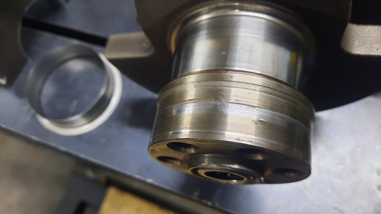 Okazało się niestety, że płaszczyzna wału, po której ślizga się uszczelniacz, ma wyrobiony rowek. Prawdopodobnie guma w starym simmeringu zesztywniała ze starości i wytoczyła ten rowek. To by ciekło... Ale na szczęście miałem (naprawdę miałem na półce, bo kupiłem do jeszcze innego silnika) pod ręką tuleję naprawczą na ten wymiar - widać ją niewyraźnie w tle.