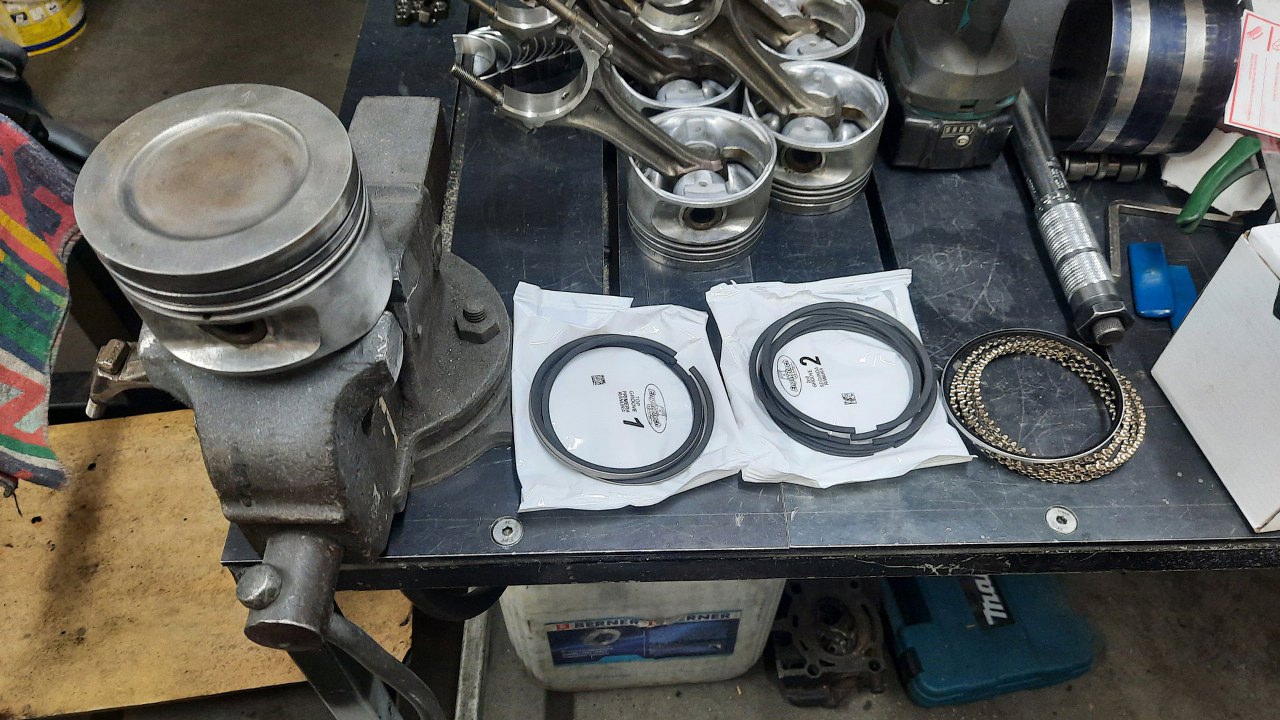 Potem mogę posmarować gładź olejem i włożyć tłok. Widać w innych cylindrach włożone pierścienie - sprawdzałem właśnie tak luz na zamku.