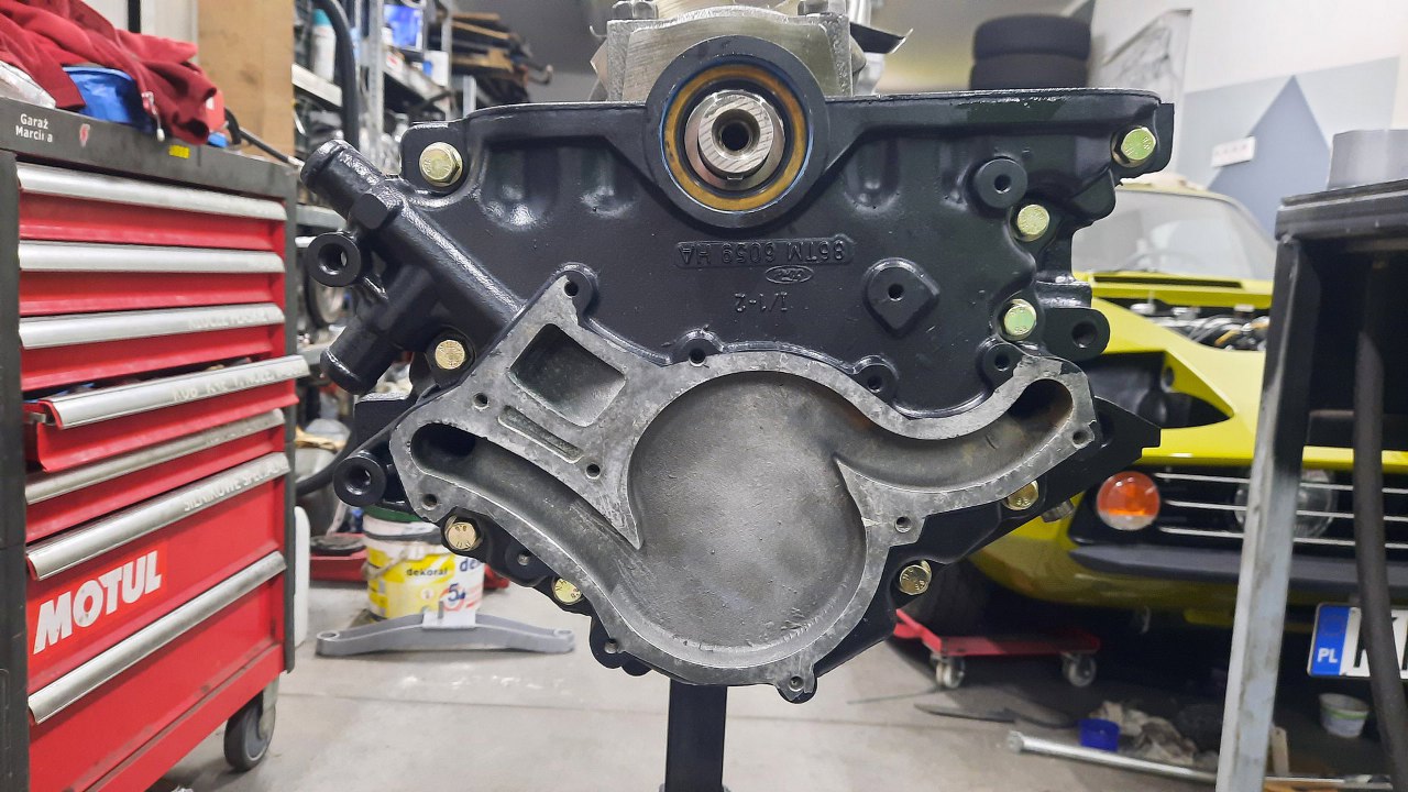 Potem sama pokrywa. Musiałem odwrócić silnik, żeby zobaczyć jak dół pokrywy pasuje do krawędzi bloku. I tak jest kluczowe co innego - po założeniu pokrywy i wstępnym załapaniu śrubek włożyłem na miejsce koło pasowe. Dzięki temu będę miał pewność, że pokrywa jest wycentrowana i simmering nie będzie przepuszczał oleju. Ford miał do tego narzędzie specjalne, ale taki poziom dokładności jest w zupełności wystarczający. Mogłem już teraz dokręcić śruby pokrywy.
