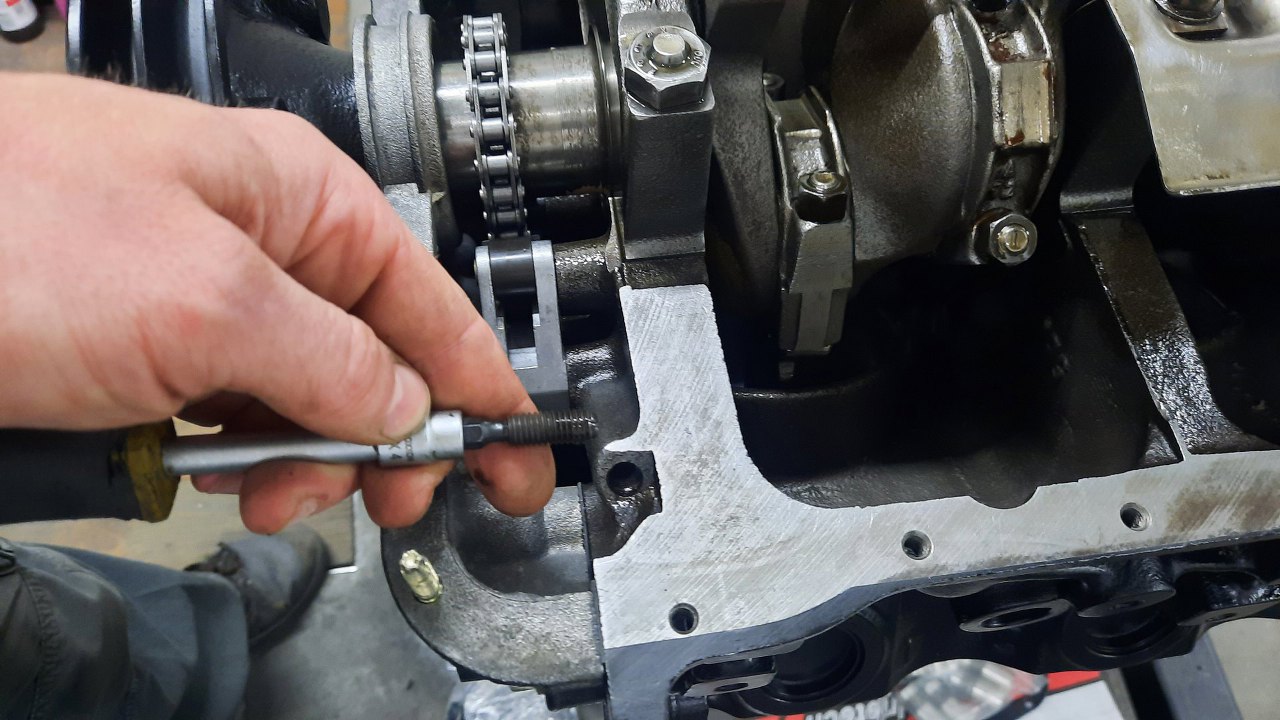 Wkręciłem sześć szpilek w blok. Chodzi o to, żeby miskę się łatwo zakładało. Tak było oryginalnie, nawet znalazłem w serwisówce rysunek, w które otwory mają być wkręcone :). To ta ocynkowana w pokywie rozrządu po lewej. A ja mam już korek do kanału olejowego. Ciut za długi, ale nawet, jak będzie wystawał, to nie szkodzi.