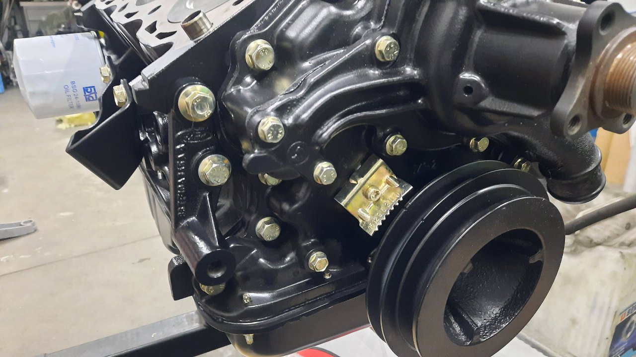 Przykręciłem też blaszkę z grzebykiem do ustawiania zapłonu i po lewej uchwyt do alternatora.