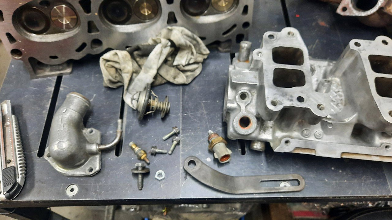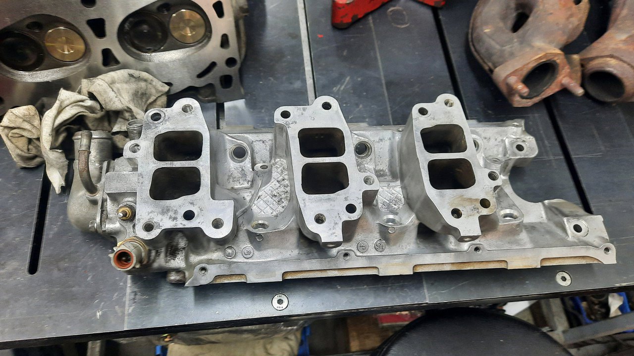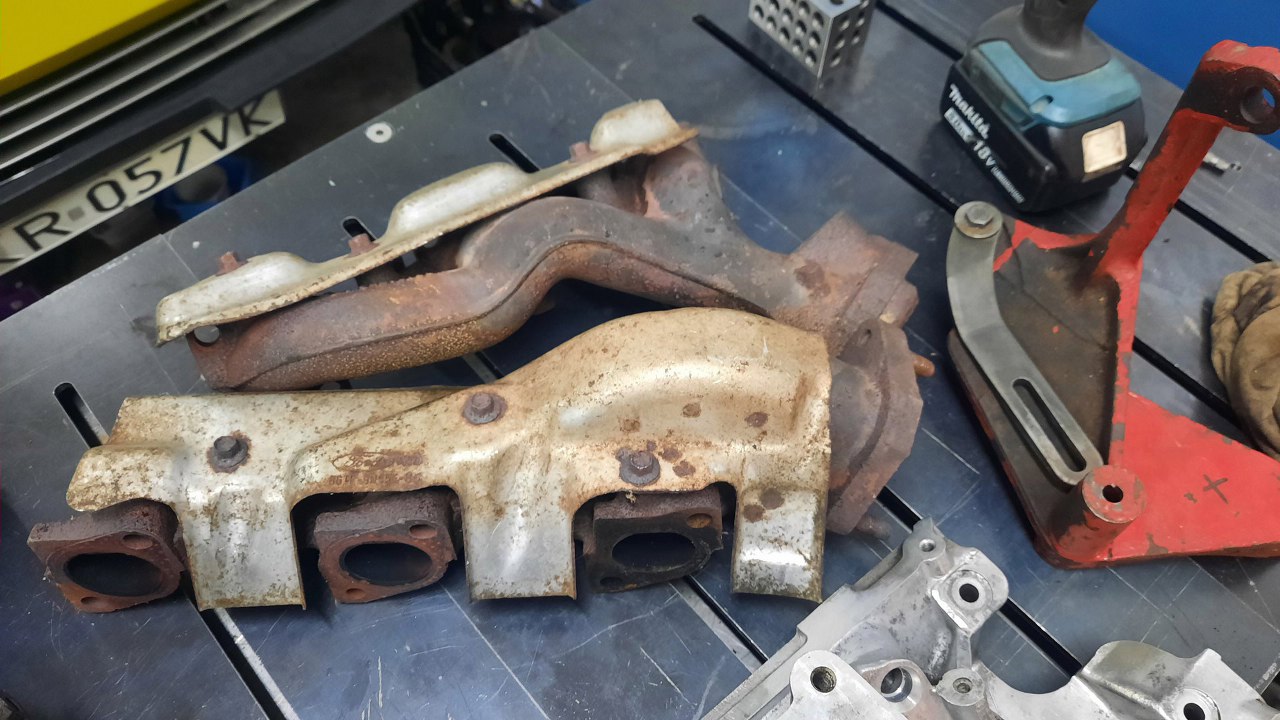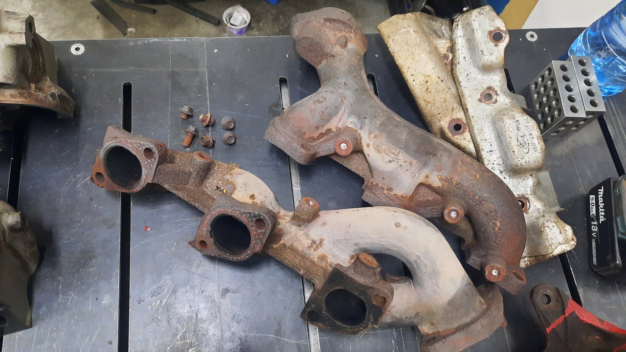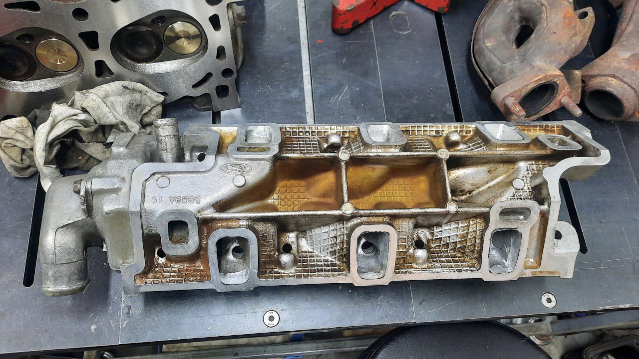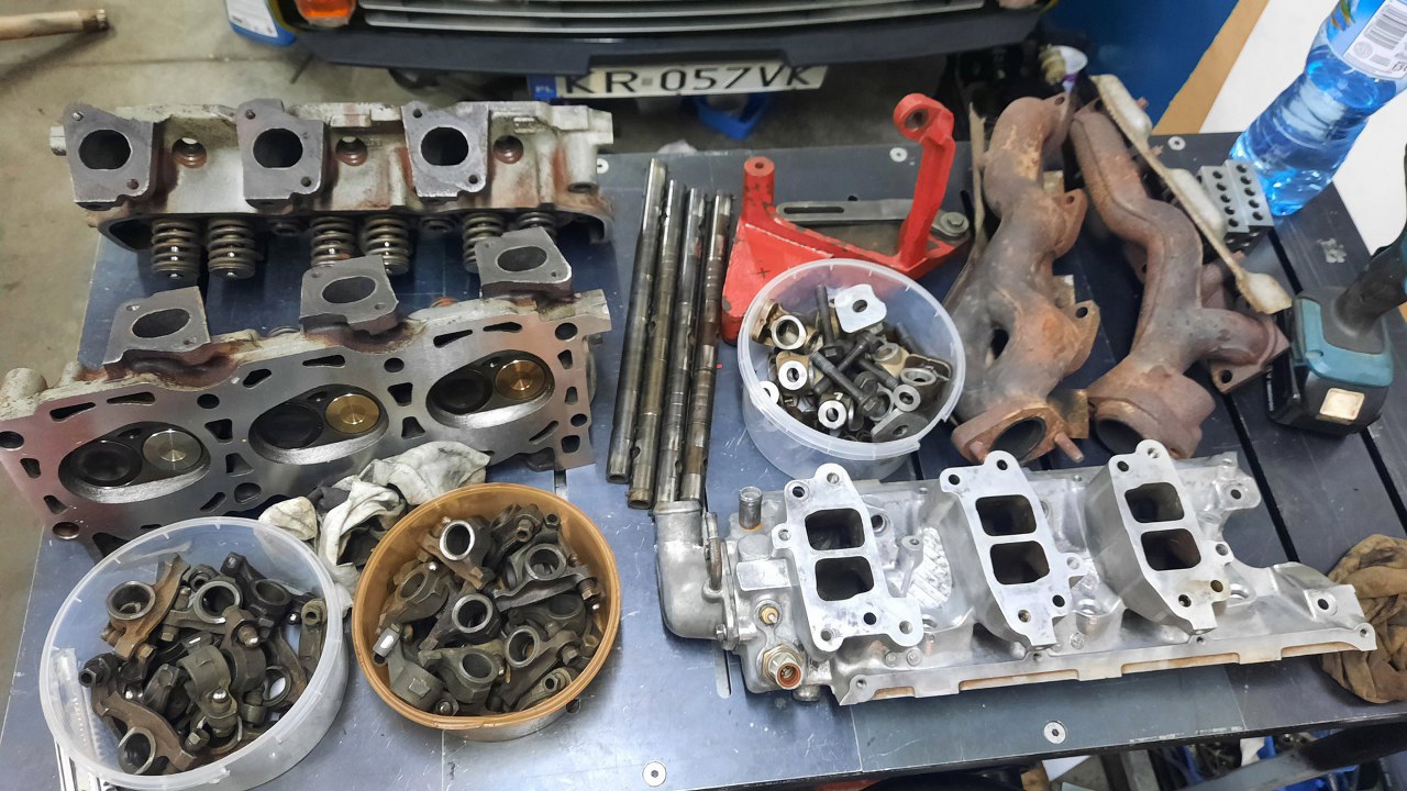 Po złożeniu dołu silnika poczekałem jeszcze kilka dni, aż przyjechała do mnie reszta gratów z silnika Tomka. Tym razem góra, nawet nie cała, bo listwę paliwową i airboxa Tomek będzie już przykręcał sam. Mam natomiast głowice, kolektory dolotowy i wydechowe i całe wiadro części dźwigienek zaworowych. Podobno są ty już trochę przebrane części, ale rozkręcone były z czterech silników. Wierzę. To leci najszybciej w tych fordowskich V-kach.
