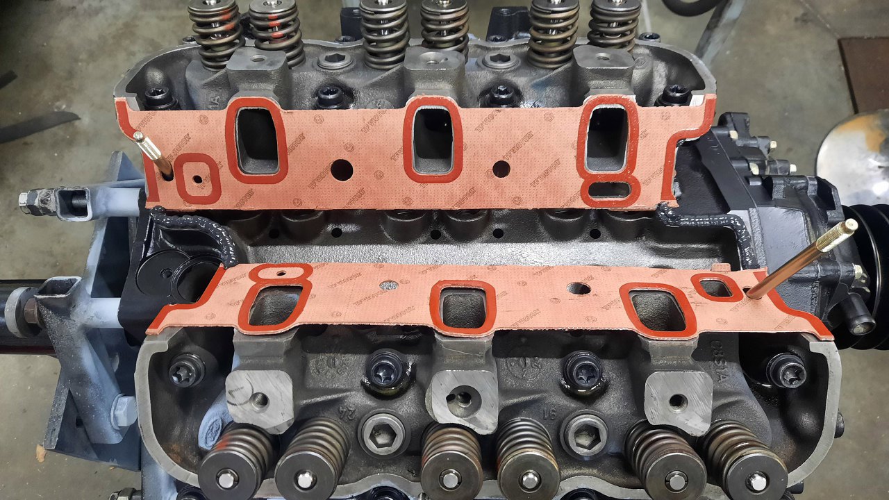 Potem przymierzyłem kolektor dolotowy. Dziwne jest to, że w serwisówce pokazane na rysunku są szpilki kolektora następująco: długa z tyłu po lewej, krótka z przodu po prawej. Tymczasem po przyłożeniu kolektora na miejsce...
