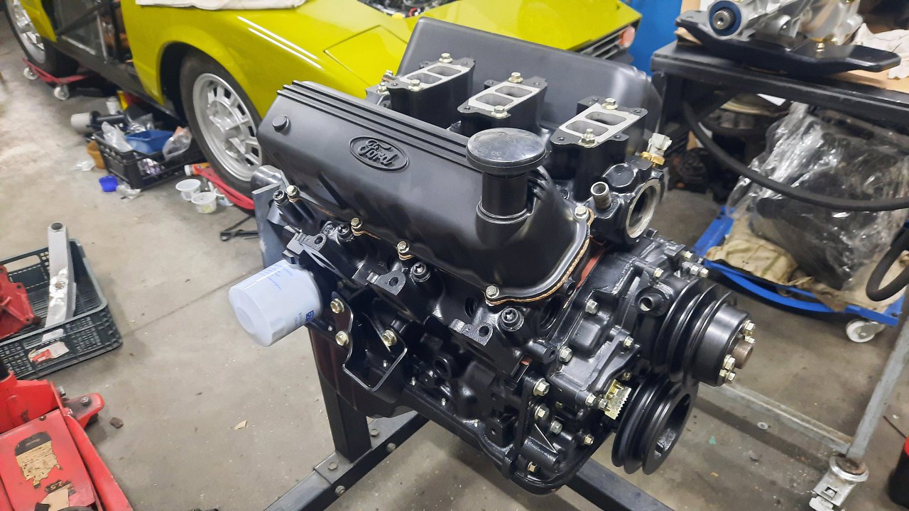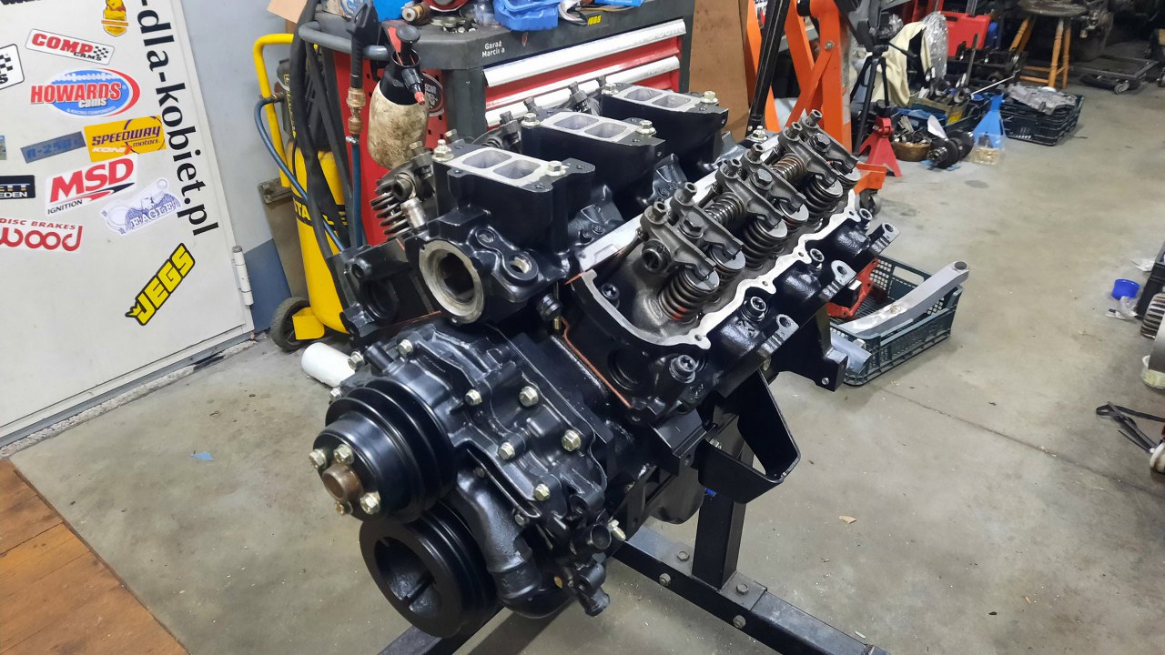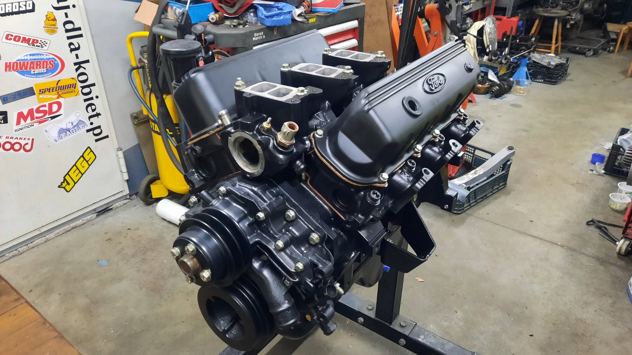 Silnik wygląda świetnie. Tomek jeszcze nie był zdecydowany, czy pokrywy zostawi całe na czarno, czy wypoleruje żeberka i logo Forda.