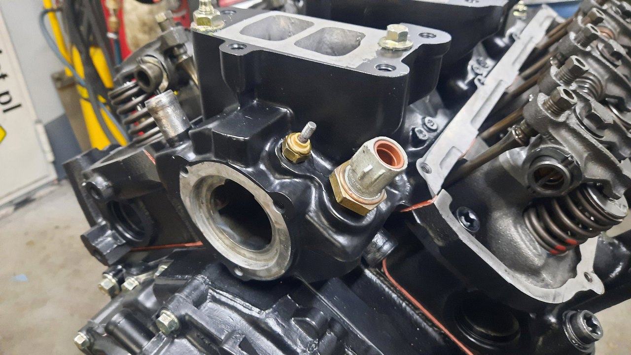 Przykręciłem czujniki temparatury cieczy chłodzącej. Ten mniejszy podłączony jest do wskaźnika w zegarach, drugi podaje informację do komputera silnika.
