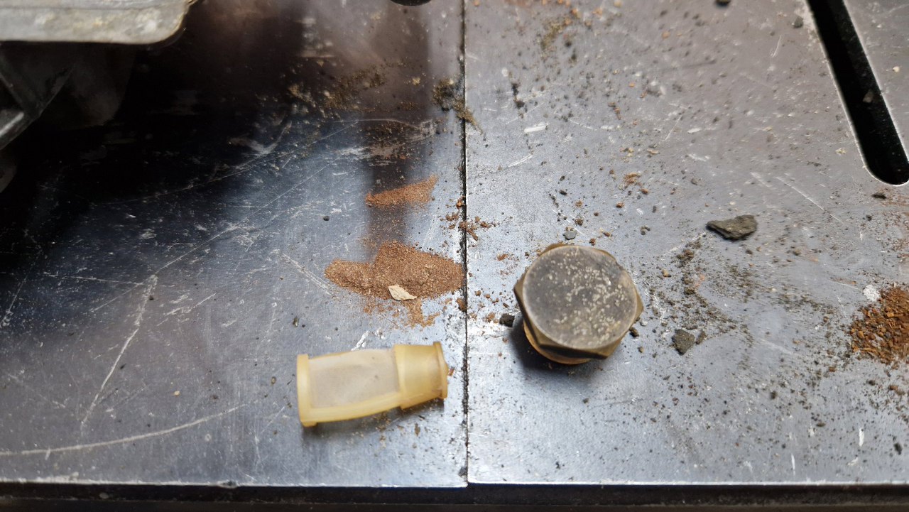 Po otwarciu pokrywy widać, że w komorze pływakowej jest trochę osadu.