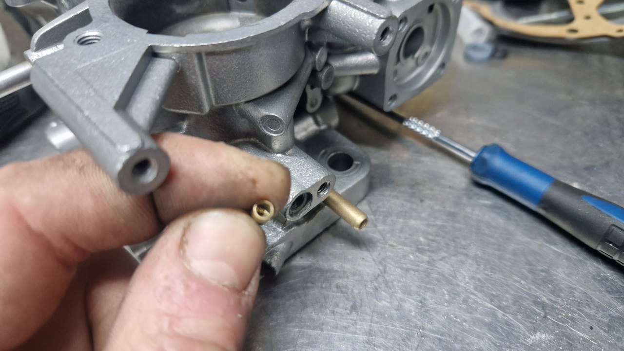 Pora na dysze. Muszą trafić na swoje miejsca - gaźnik jest niesymetryczny i są różne dysze w obu gardzielach.
