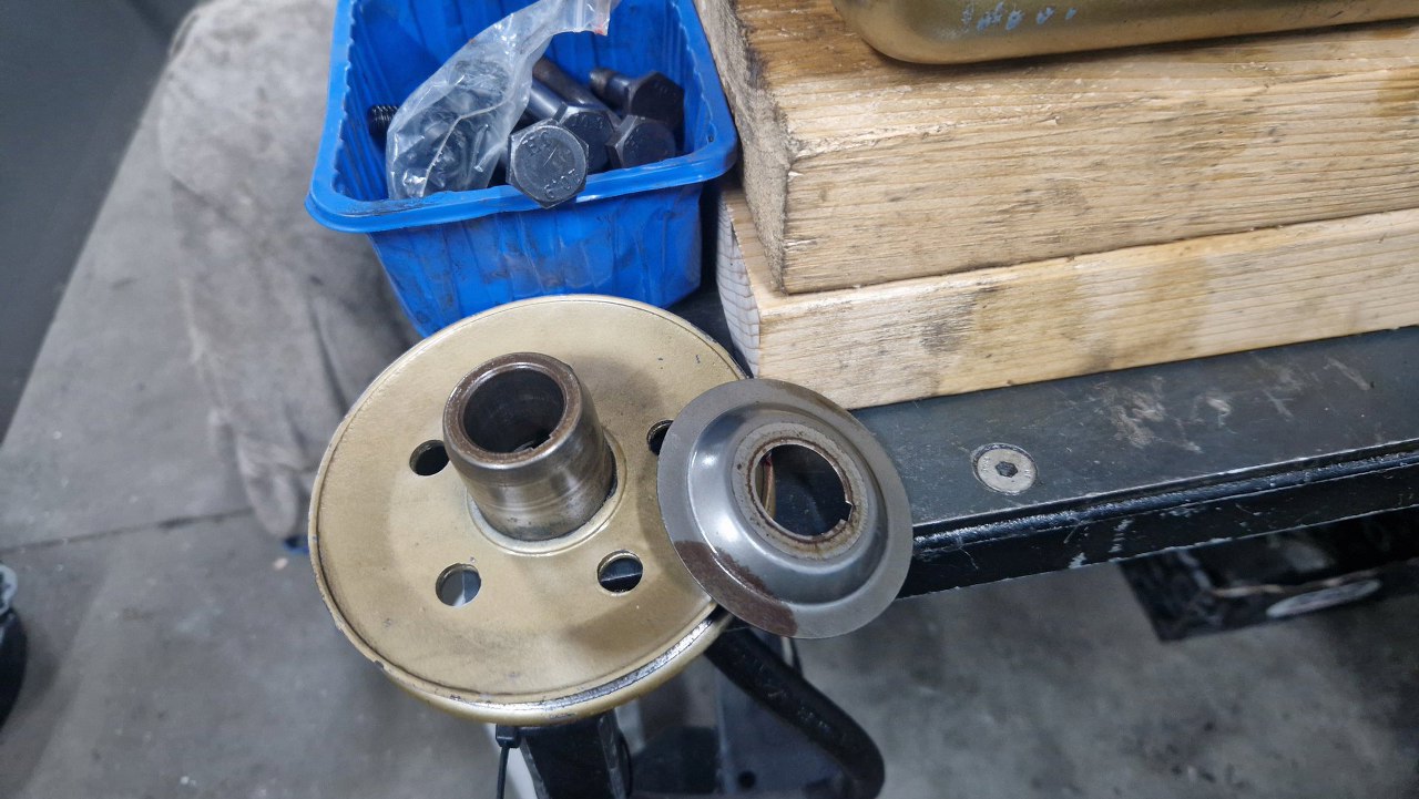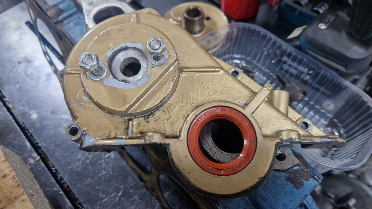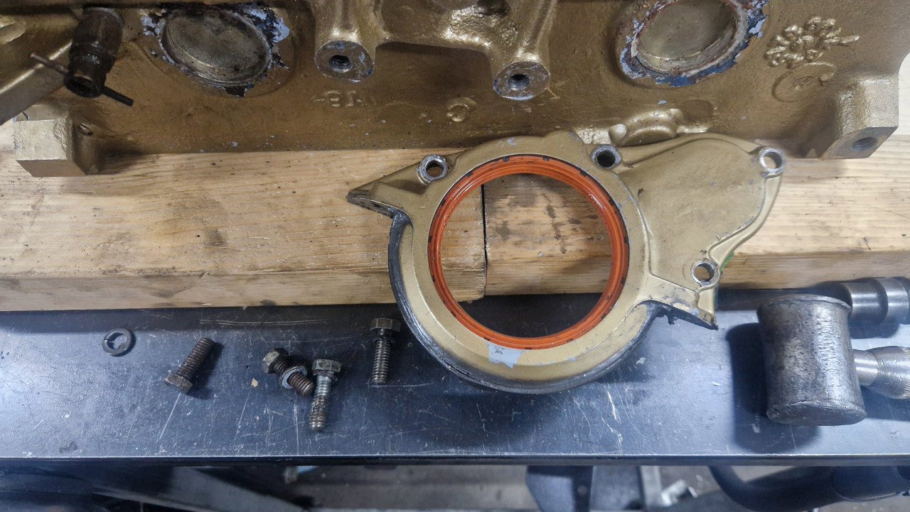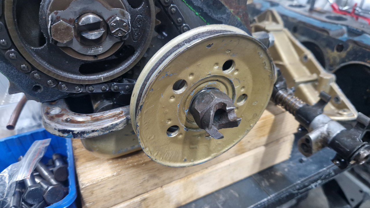 Po zdjęciu koła pasowego mamy jeszcze talerzyk osłaniający łańcuch rozrządu, żeby olej z łańcucha nie leciał w stronę uszczelniacza przedniego. W tle jest ciekawa rzecz - śruby głowicy. Oryginalnie cały silnik jest calowy, śruby też. Ale śruby głowicy mają oznaczenia twardości 10.8, metryczne. Ktoś kiedyś robiąc remont, dorobił właściwe śruby z metrycznych, staczając je i gwintując na odpowiedni gwint calowy. Szanuję :).