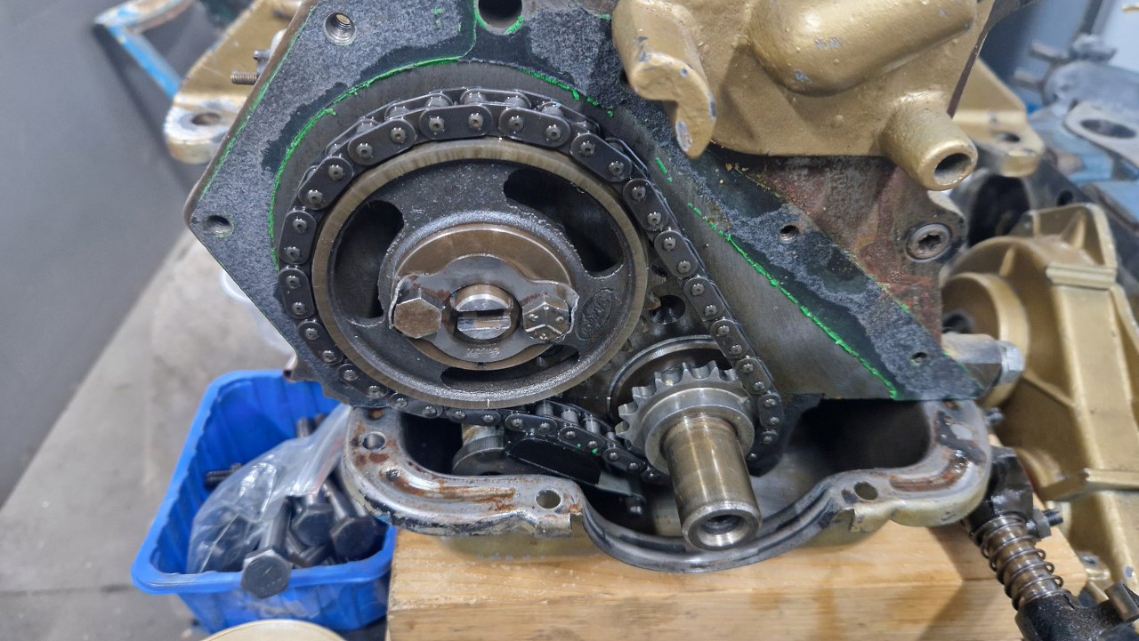 A tu rzut oka na pokrywę łańcucha rozrządu. Oryginalna fordowska pokrywa ma wyfrezowane płaskie miejsce na wprost wałka rozrządu, jest tu przykręcony okrągły element aluminiowy jako podstawka pod pompę wody zewnętrznej. Pompa jest mosiężna, z gumowym wirnikiem, typowe dla łódki rozwiązanie. Napędzana jest bezpośrednio z wałka rozrządu, z tamtego nacięcia.
