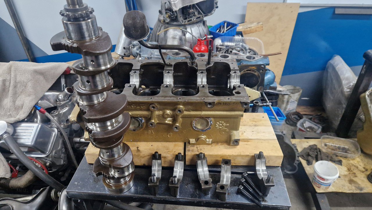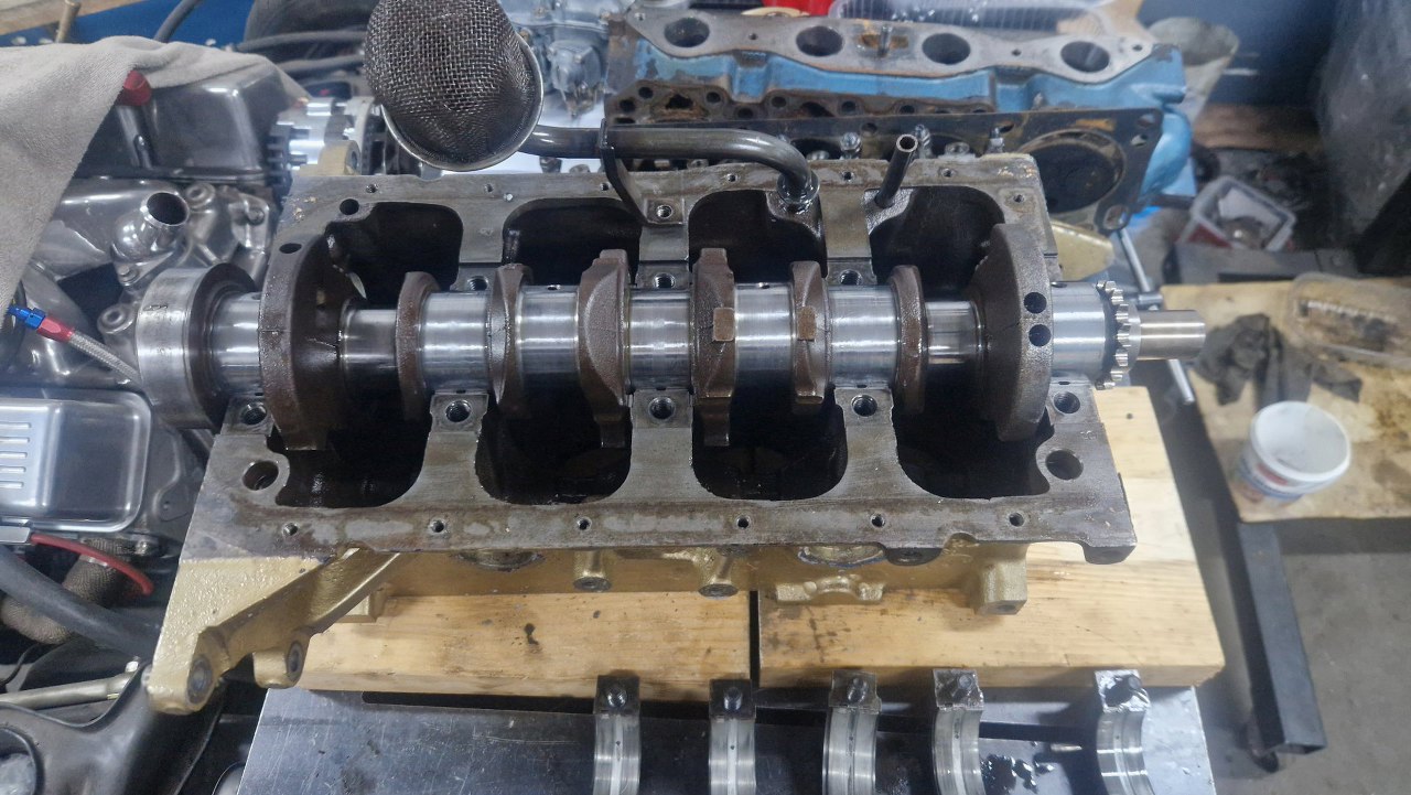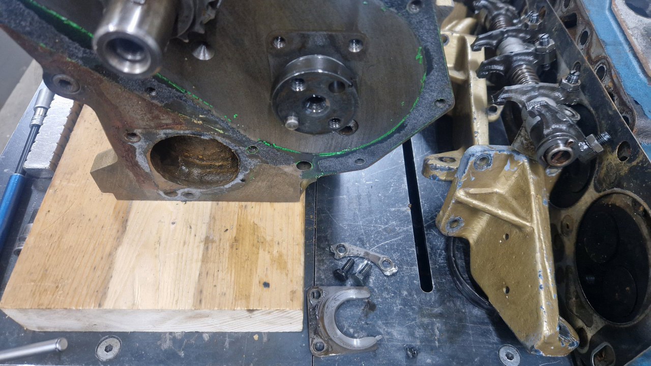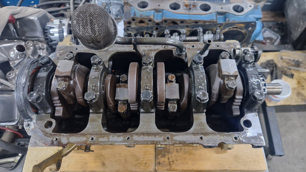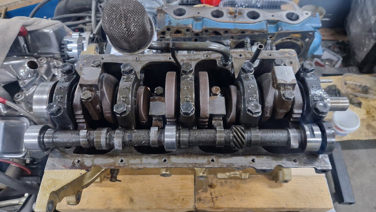 Przeszkadzał mi trochę smok pompy oleju, więc go wyciągnąłem. Stopy walu z panewkami przykręciłem, żeby pomierzyć luzy na wale.