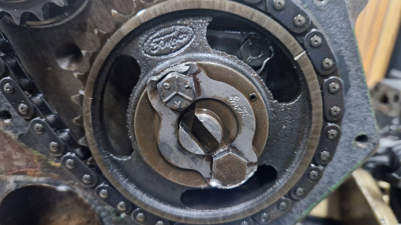 Koło wałka rozrządu przykręcone jest dwiema różnymi śrubami, ciekawe dlaczego. Też ciekawe jest to, że podkładka zagniatana na śrubach jest jeszcze oryginalna, z fordowskim logiem EnFo. Na samym kole jest inne, też fordowskie FoMoCo.