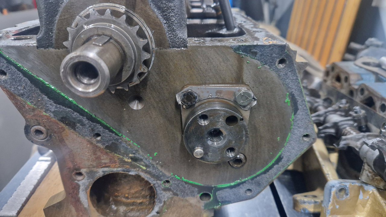 Pierwsza weryfikacja - ustawiłem rozrząd i wszystkie znaczniki się zgadzają, więc tu wszystko było w porządku. Jedna rzecz jest tu inna niż w samochodzie - na wałku rozrządu jest jeszcze dodatkowa część, z nacięciem, widoczna pomiędzy śrubami na wałku.