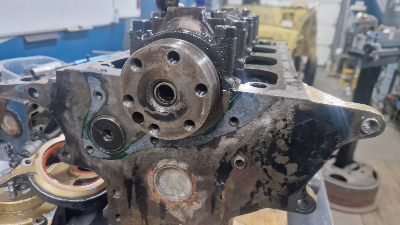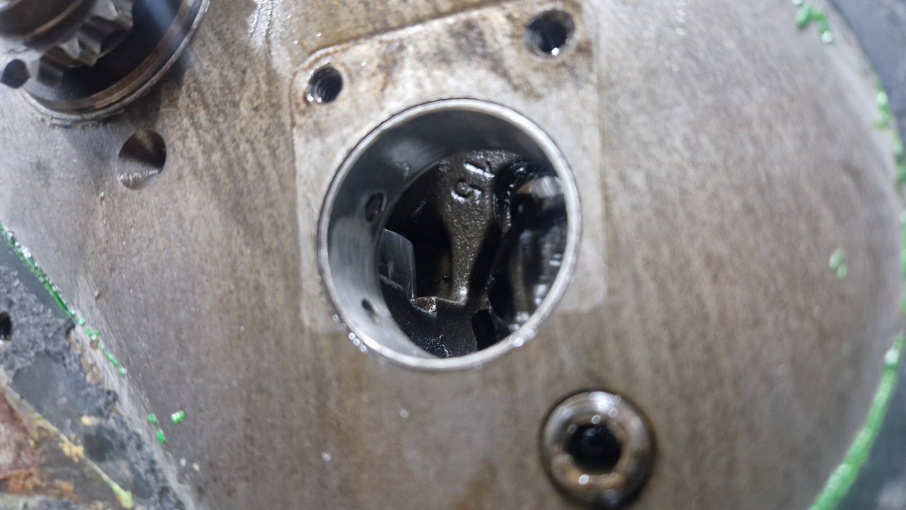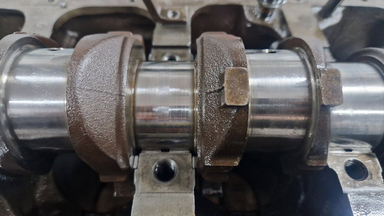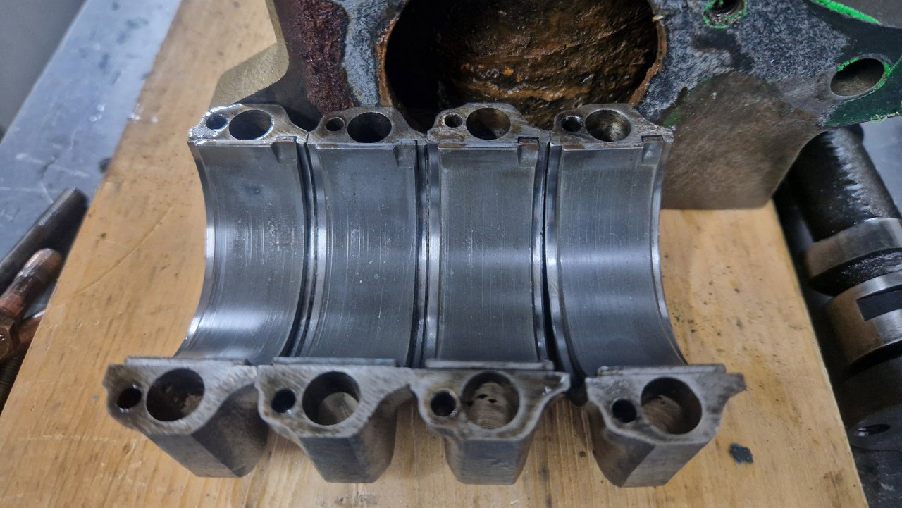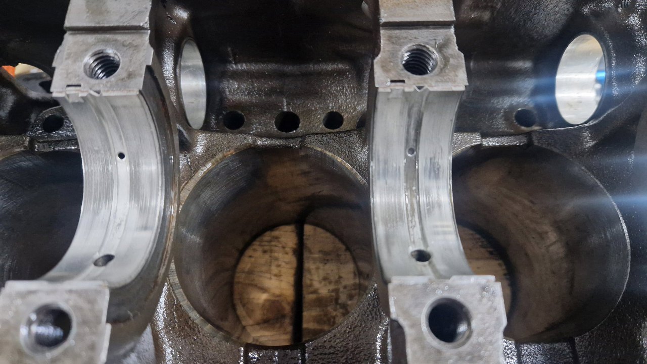 Po wyjęciu wału widać drugie połówki panewek głównych.