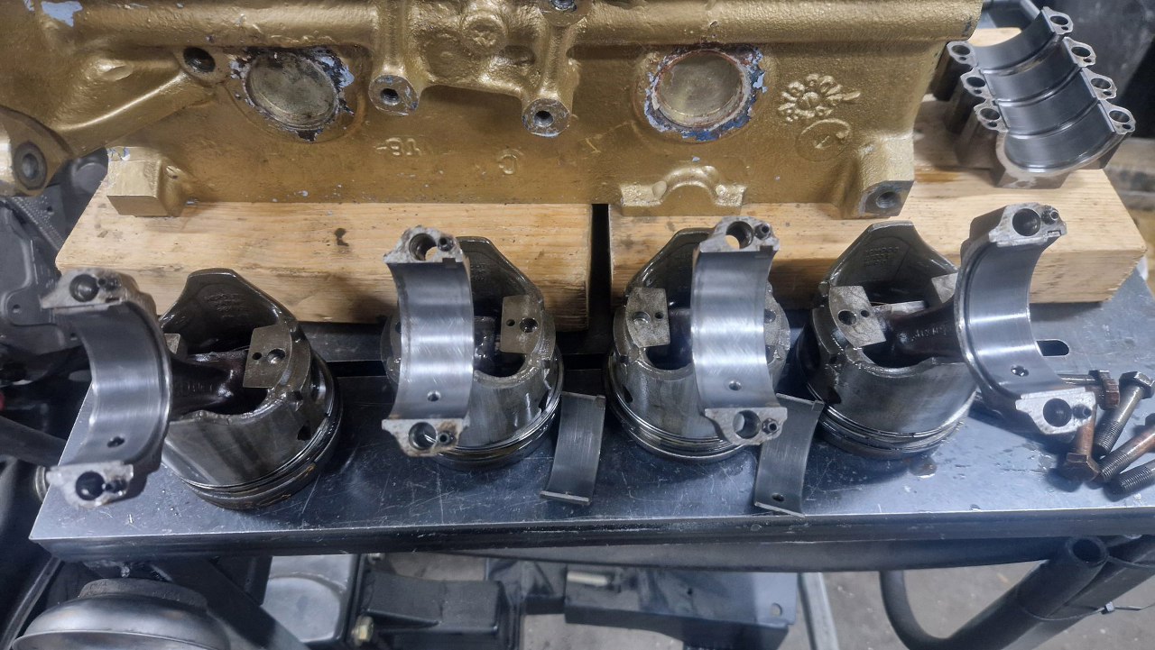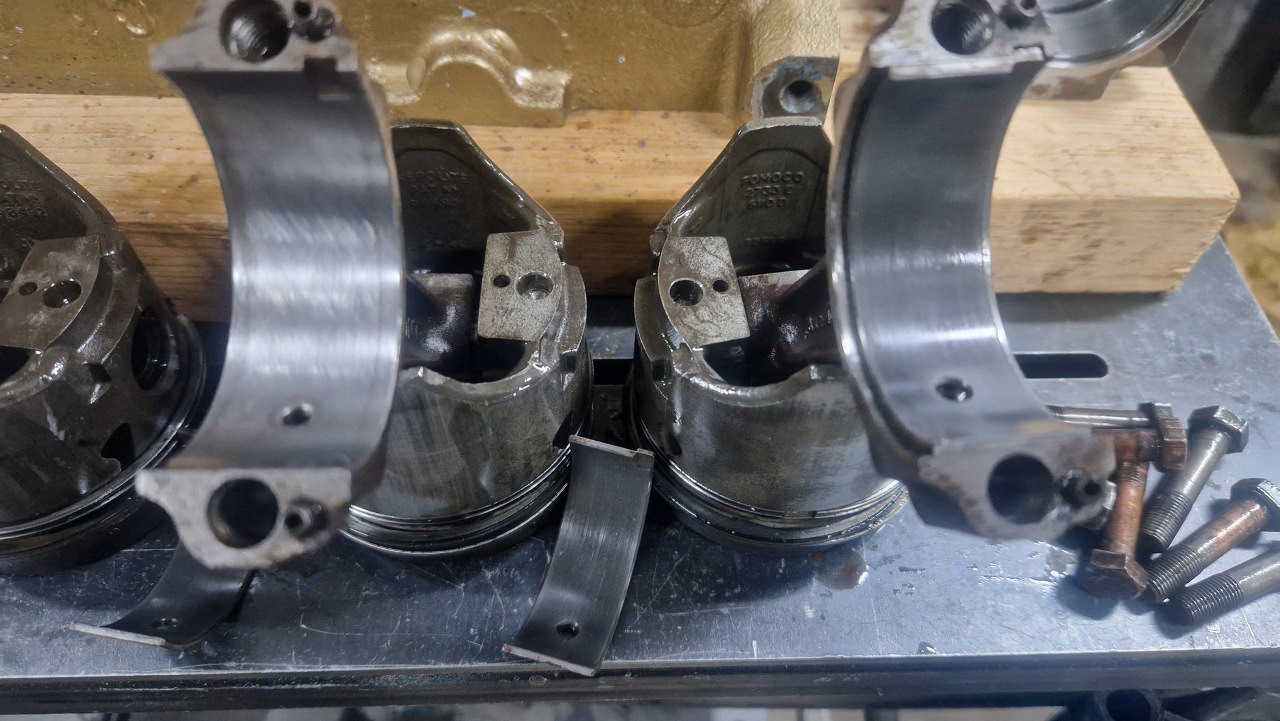 Odkręciłem korbowody. Panewki w niezłym stanie, trochę porysowane. Podejrzewam, że będa mogły mimo to zostać, przy śladowym przebiegu od remontu mogą jeszcze trzymać wymiary.