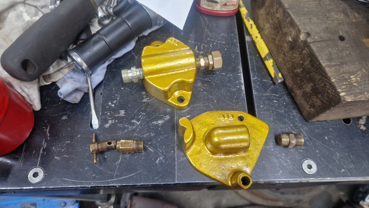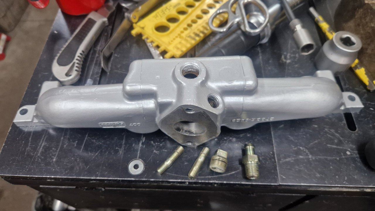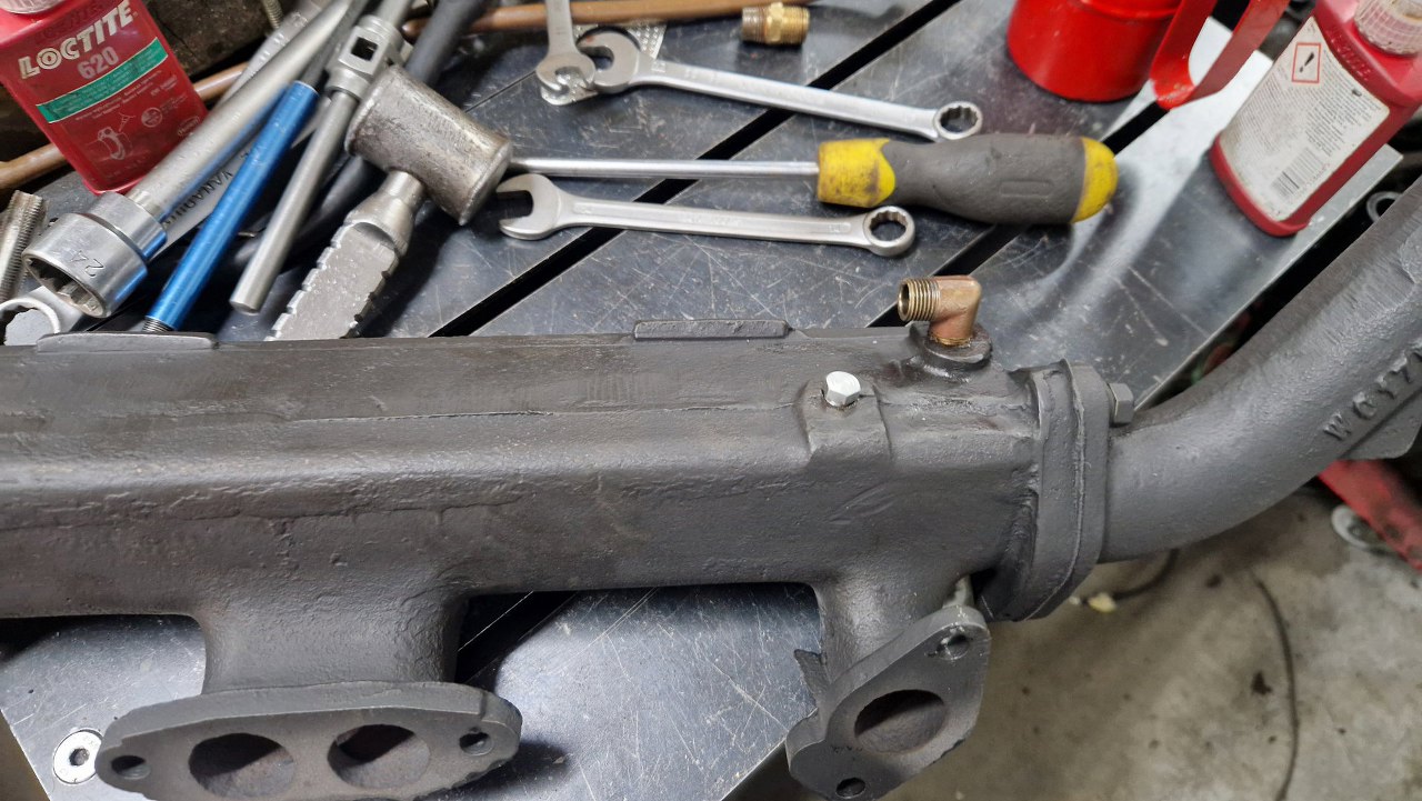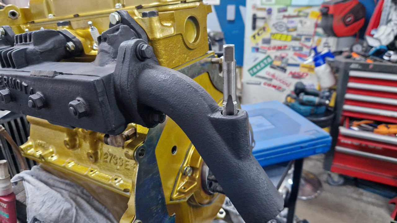 W kolektorze wydechowym od dołu poprawiłem gwint i wkręciłem kolanko pod rurkę chłodzenia (kolektor jest chłodzony cieczą).