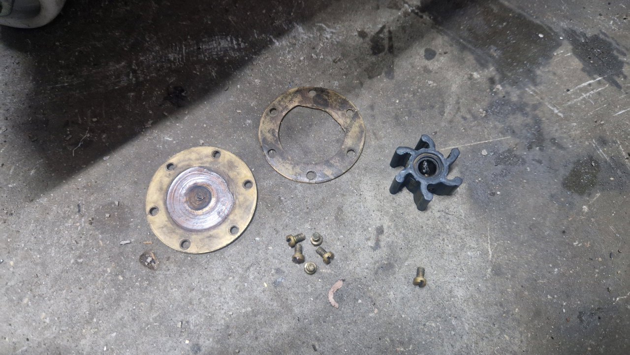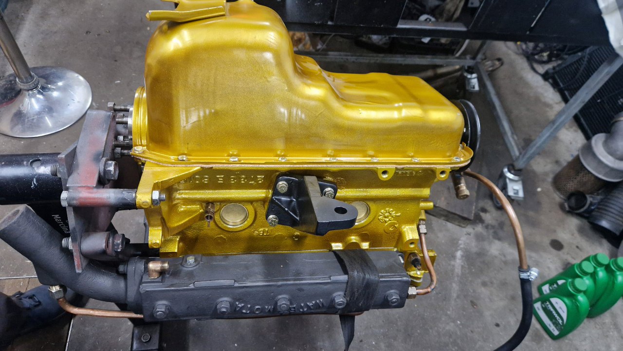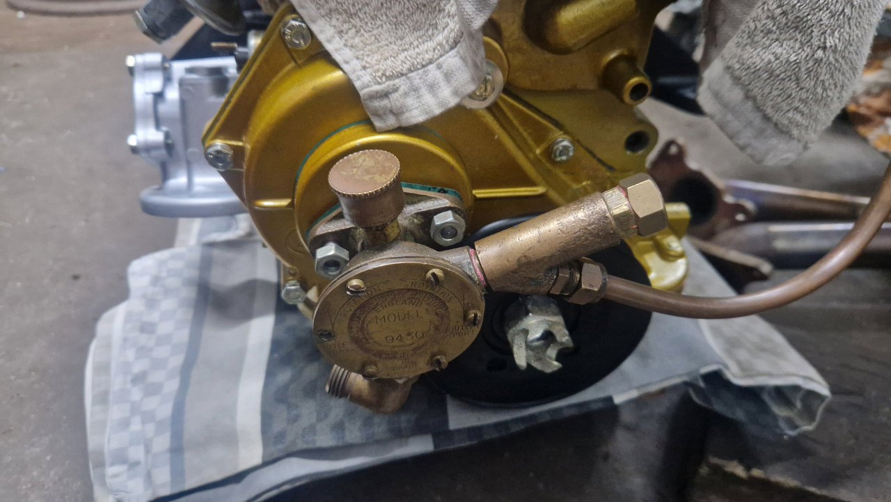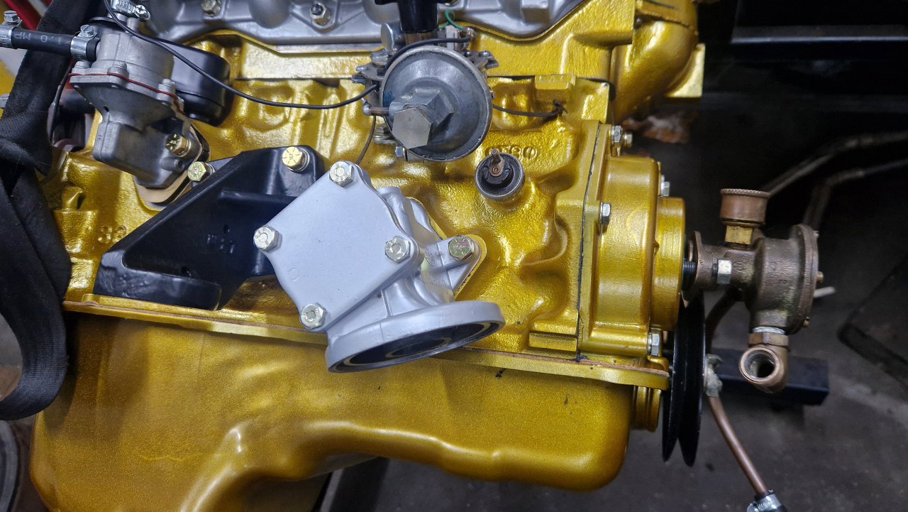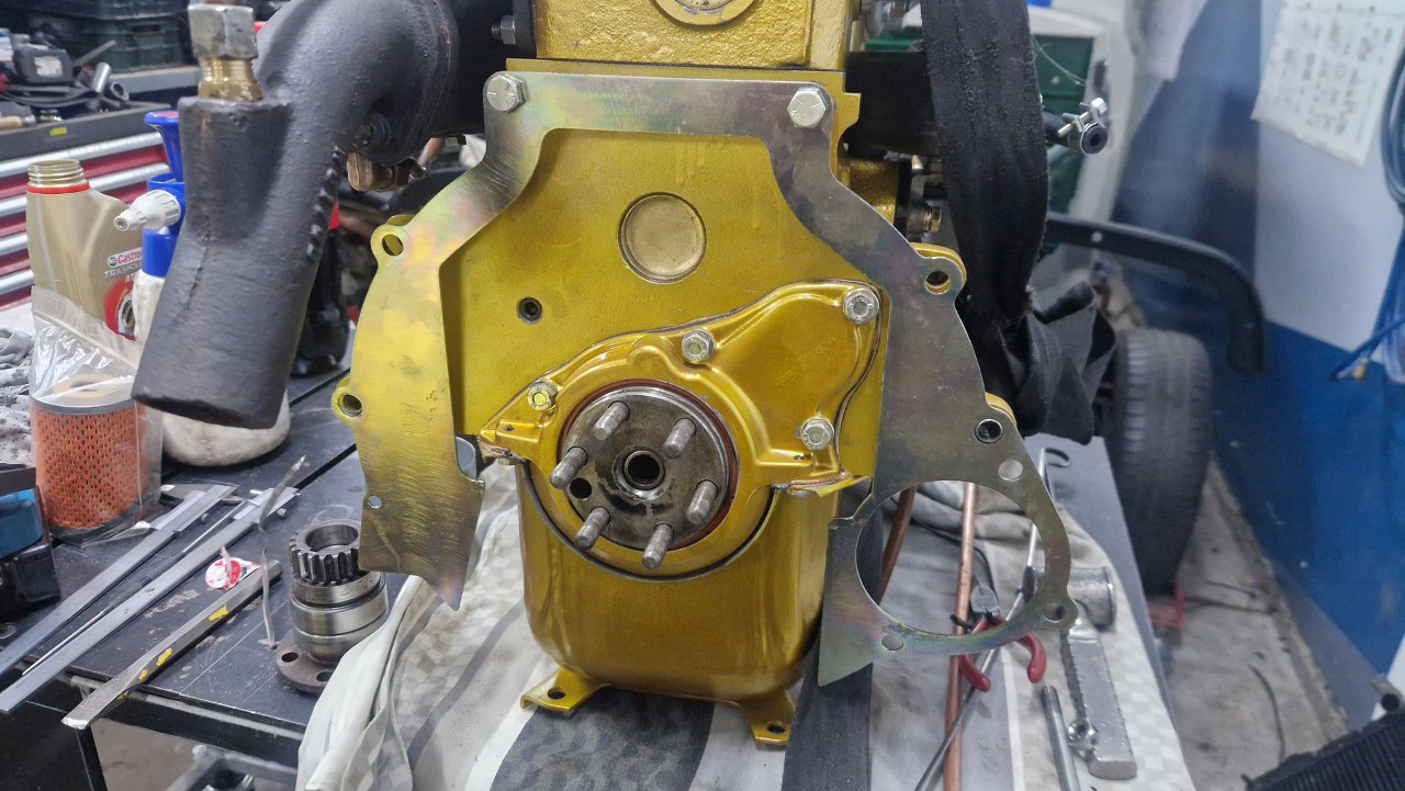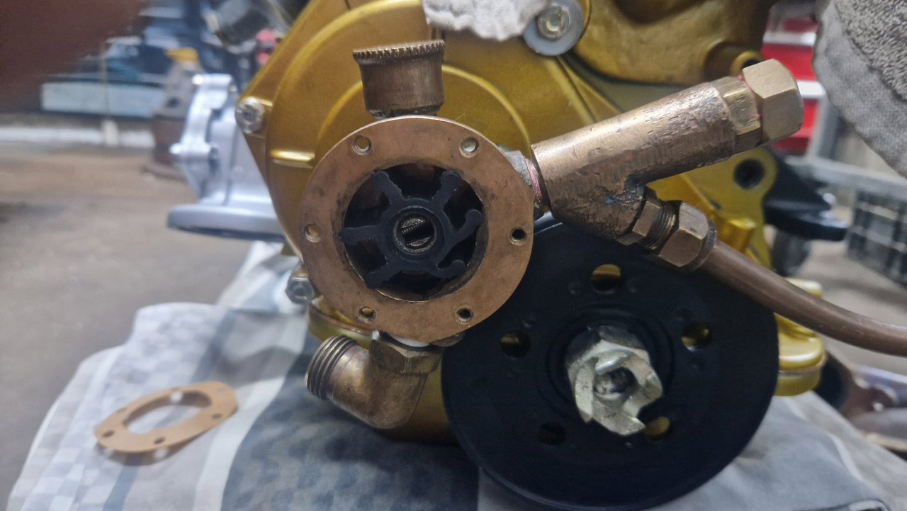 W międzyczasie zamontowałem pompę wody zaburtowej. Napędzana jest z wałka rozrządu.