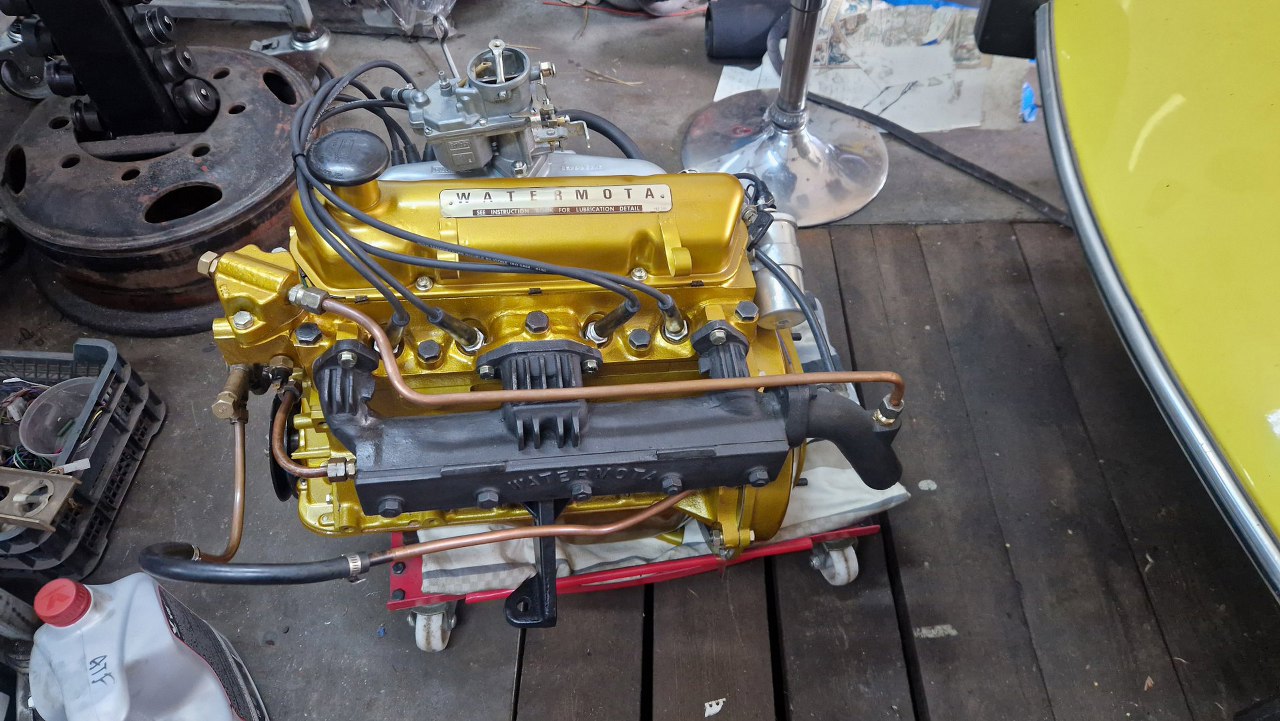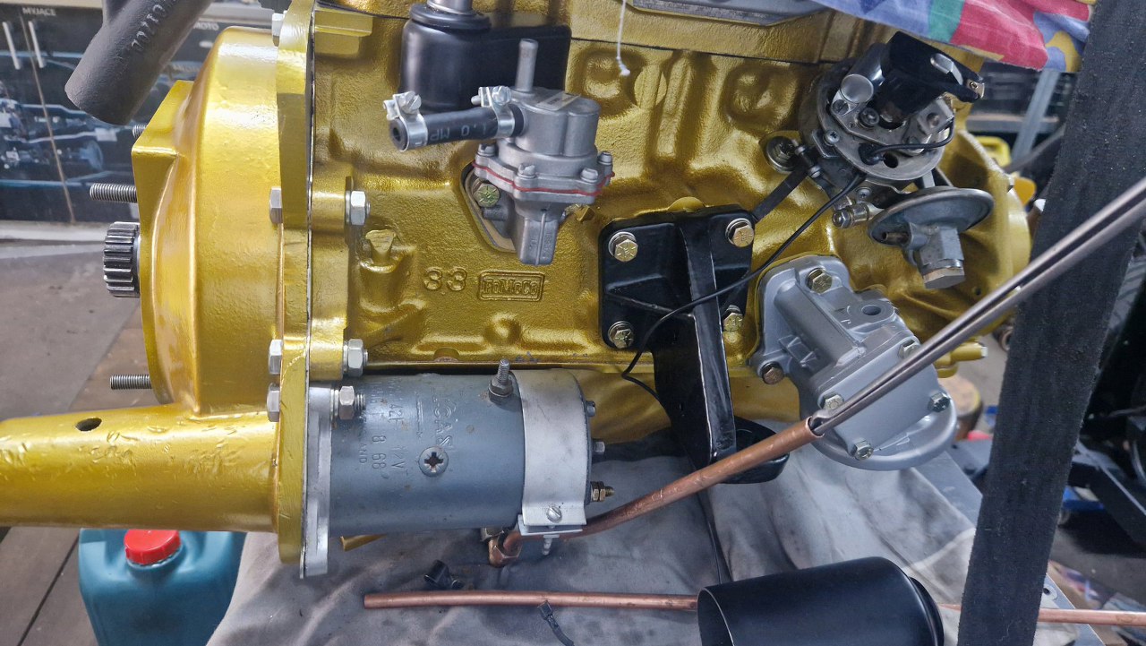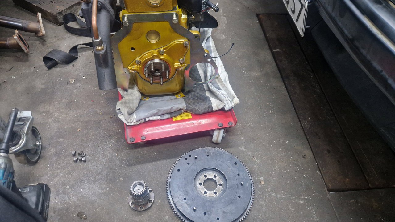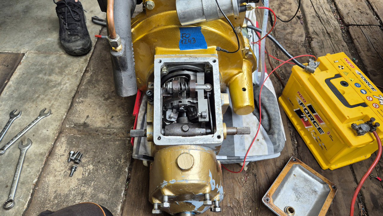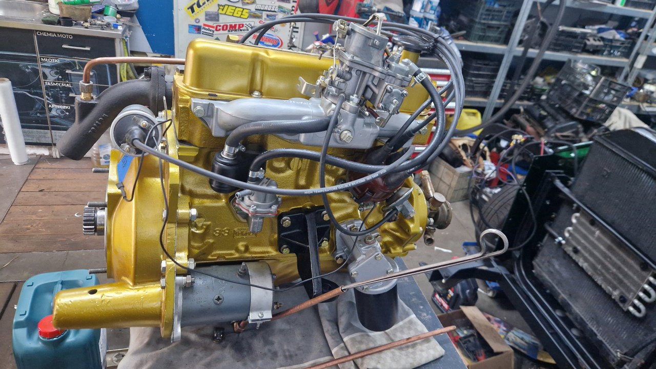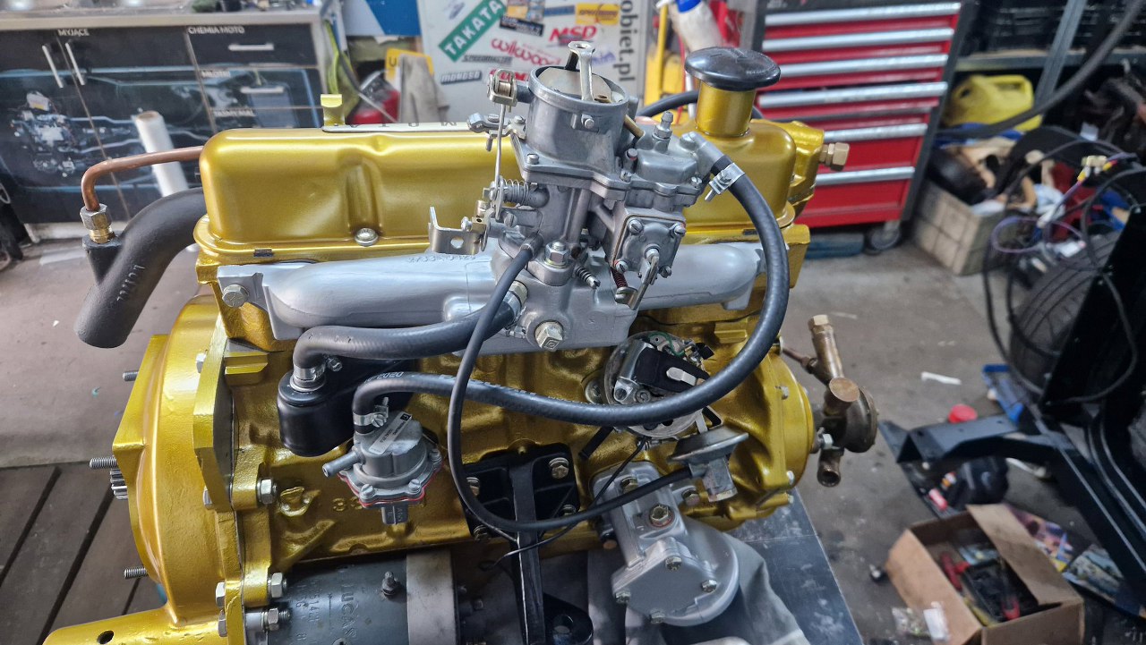 A tu już silnik na podłodze. Niedługo będzie podłączony do akumulatora i uruchomiony.