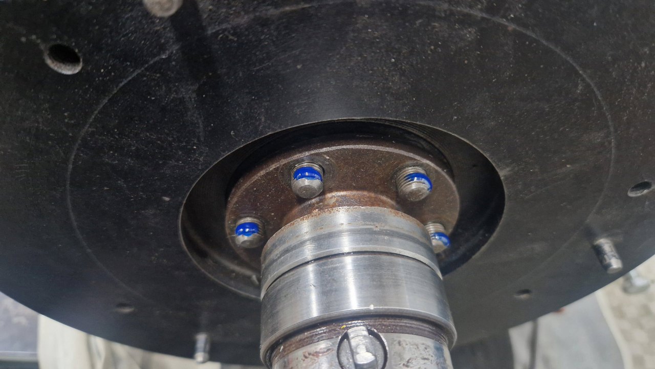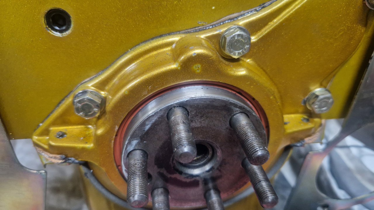 A tu już koło namiejscu, założony też element napędu. Zanim przykręcę nakrętki kapnąłem tu kleju do gwintów.