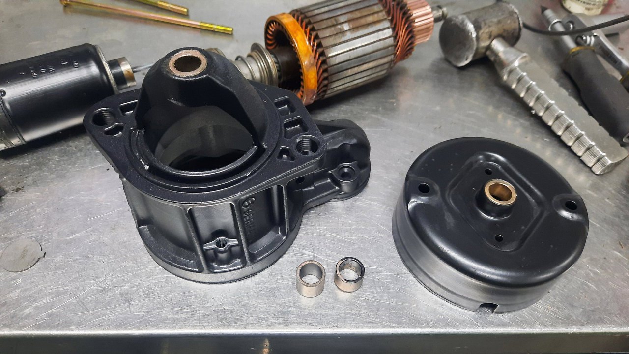 Tu znowy robię magiczne "pstryk" i mam odnowione już części. Przygotowałem też nowe tulejki. Reszta części rozrusznika jest w dobrym stanie i nie ma co ich wymieniać.