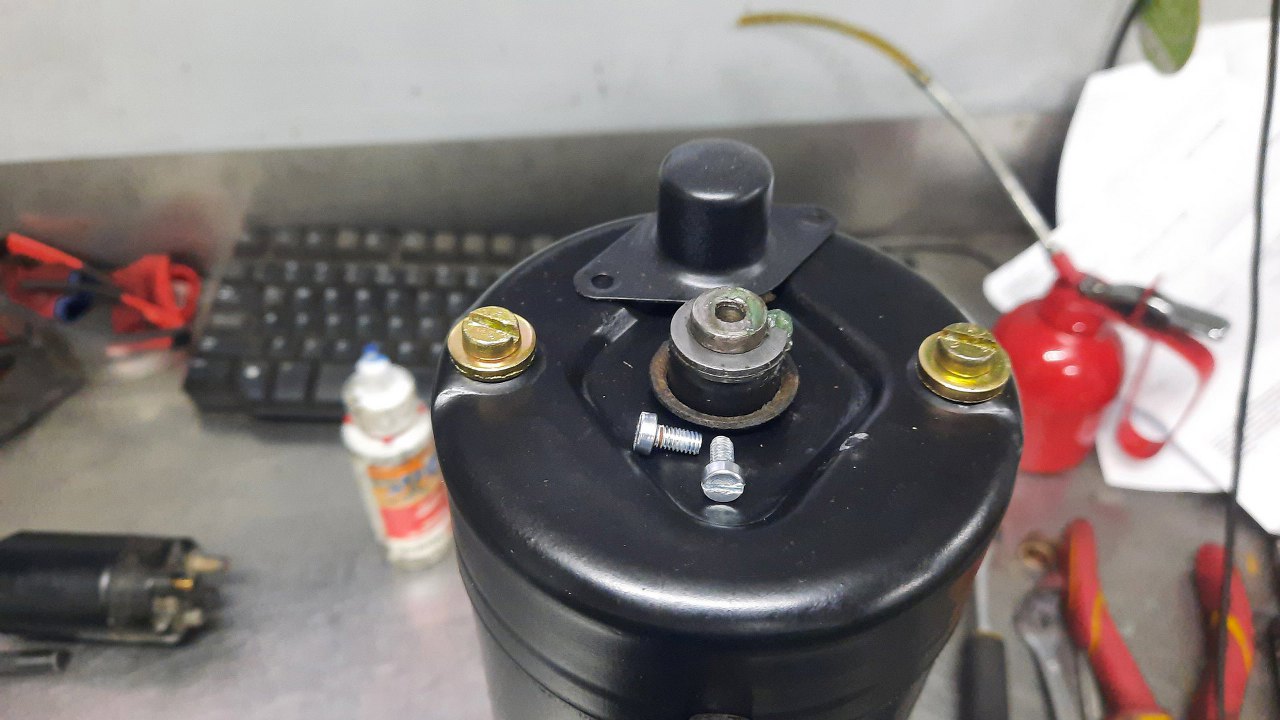 Do środka aparatu włożyłem kondensator i nowy przrywacz. Stary przerywacz miał już bardzo wypalone styki. Palec zostaje ten, co był, jest w dobrym stanie. W otworze w ośce aparatu jest głęboko osadzony kawałek filcu. Co zmianę oleju należy tam kapnąć kropelkę oleju, która smaruje resztę aparatu. Zazwyczaj mało kto o tym pamięta, co prowadzi do problemów z działaniem mechanizmów w aparacie.