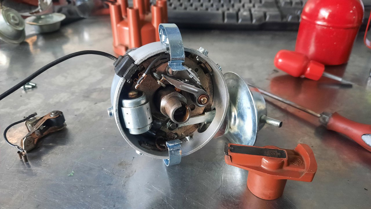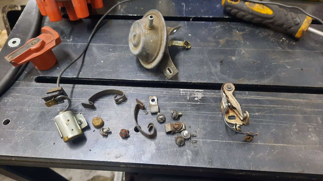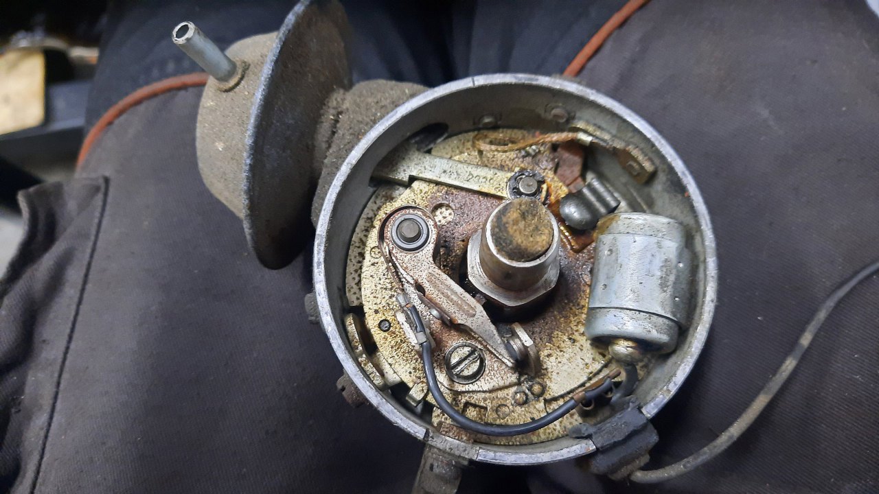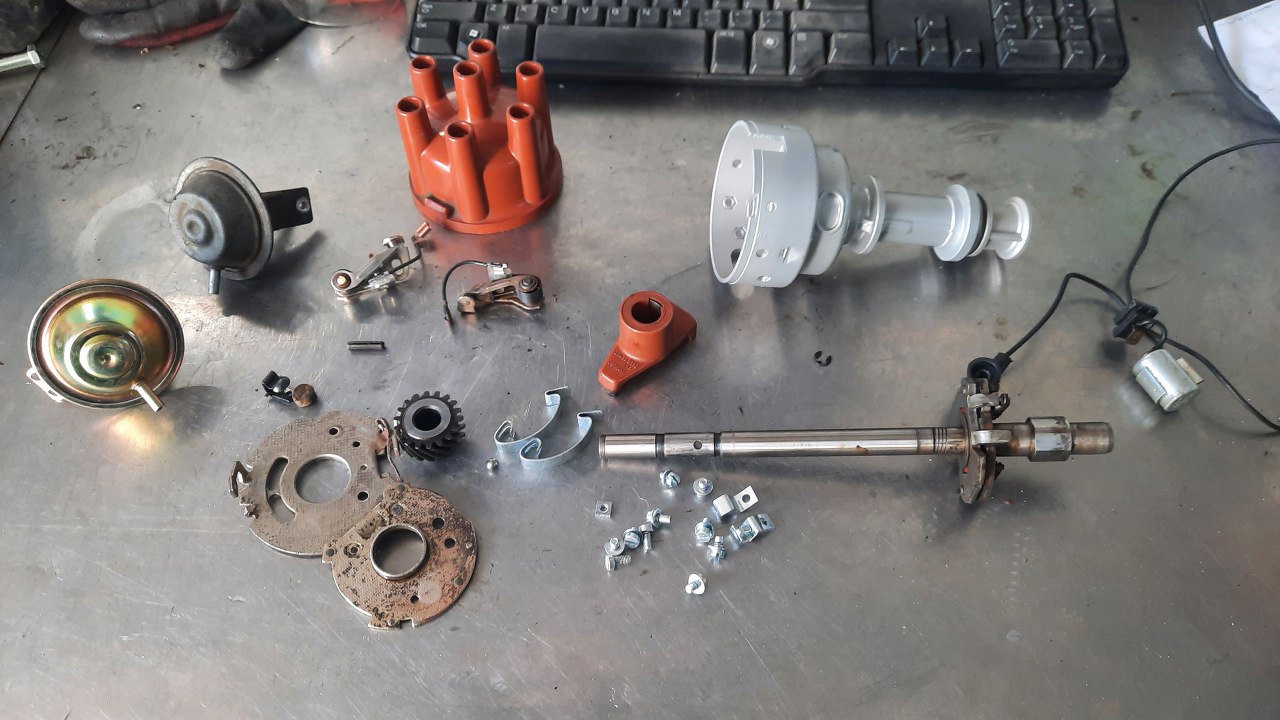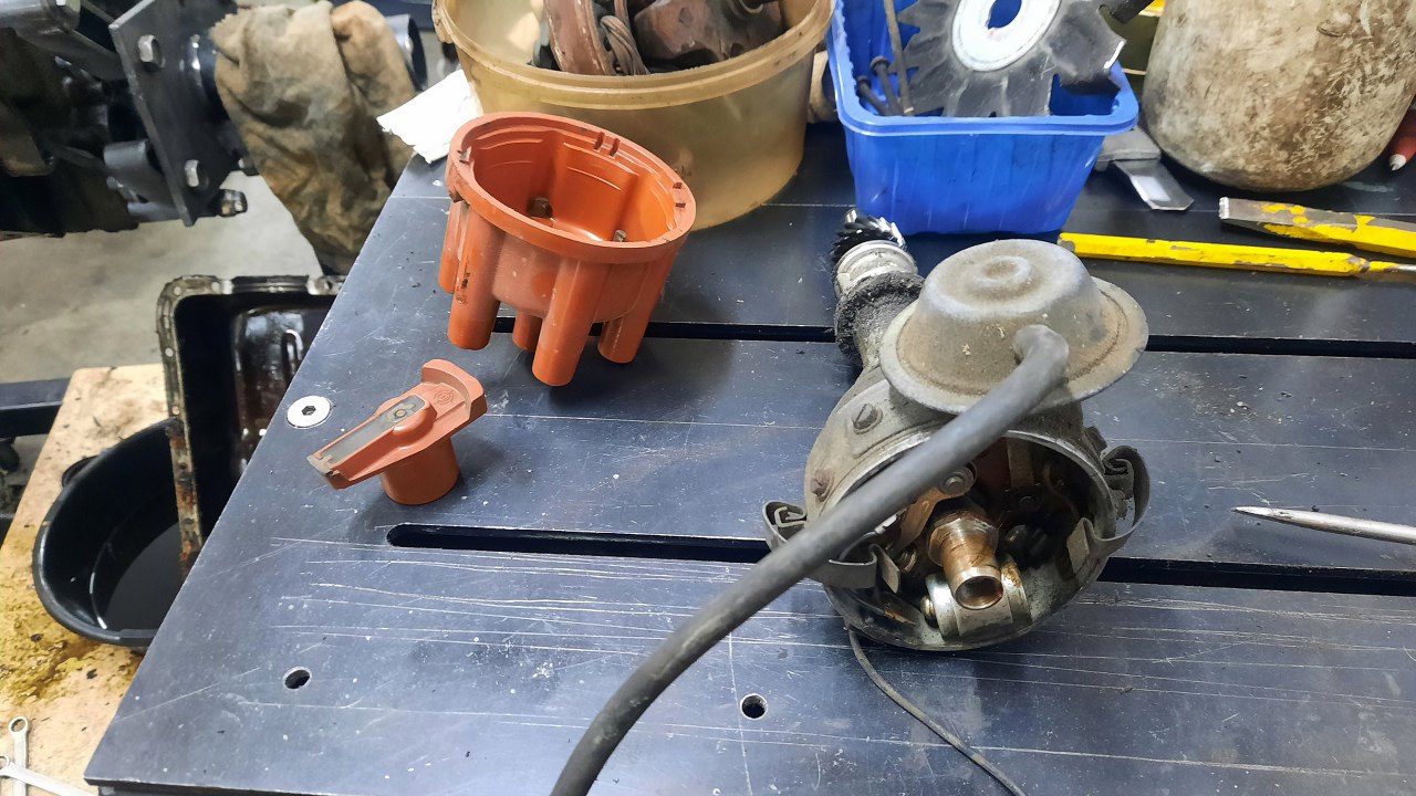 Odkręciłem co się dało, łącznie z puszką podciśnienia, kondensatorem i przerywaczem. Jestem bardzo zaskoczony, że Ford z 1984 roku ma jeszcze przerywaczowy układ zapłonowy. Na moje oko powinien już mieć układ z modułem zapłonowym, ale wygląda, że tak wyjechał z fabryki, więc tak ma być.