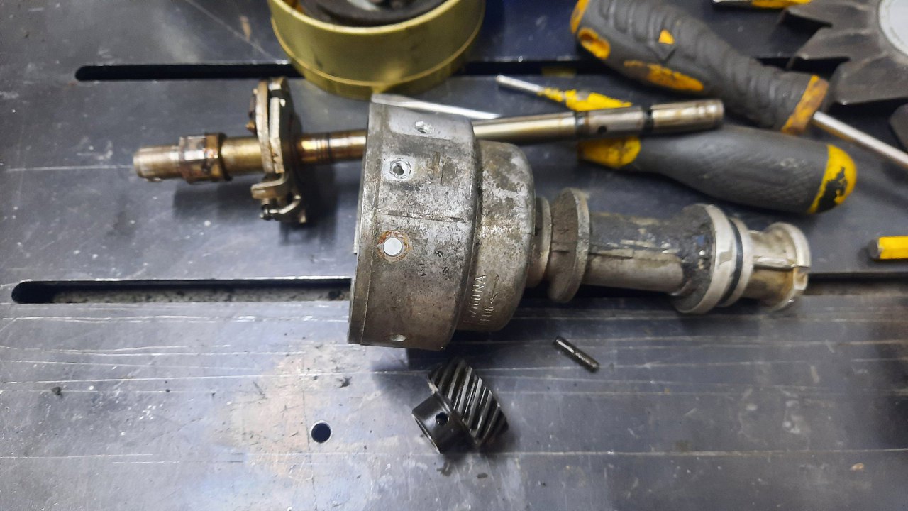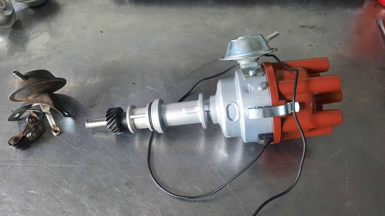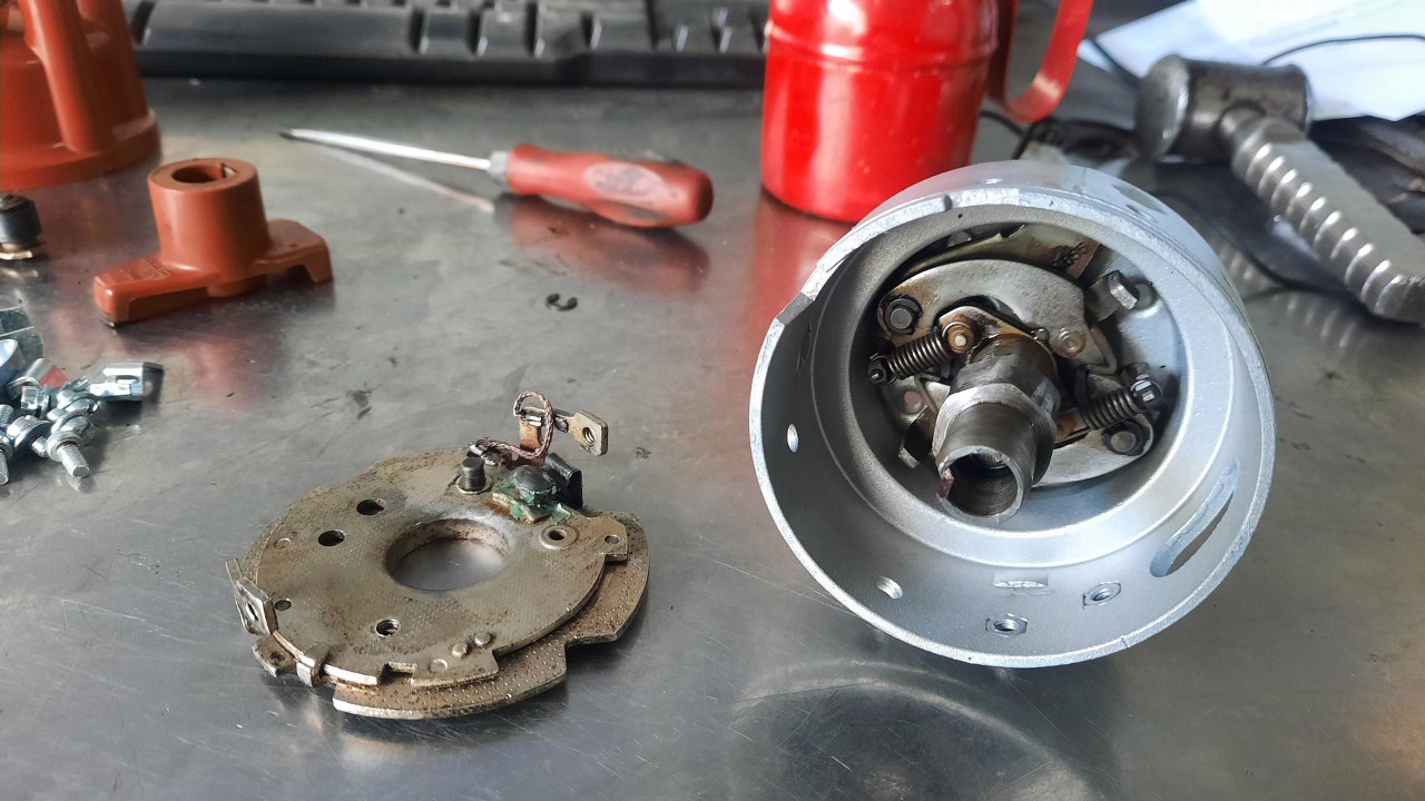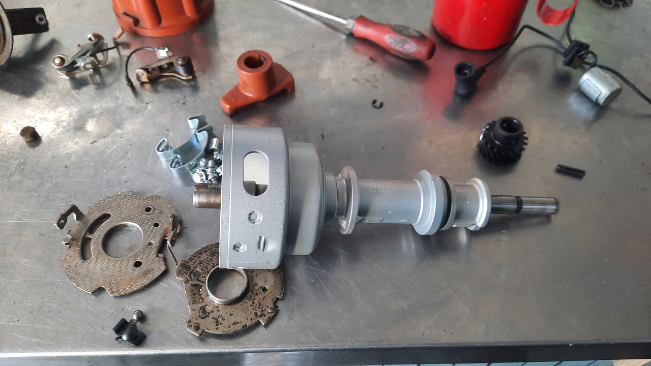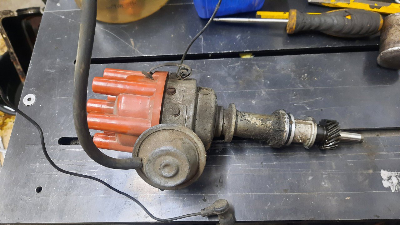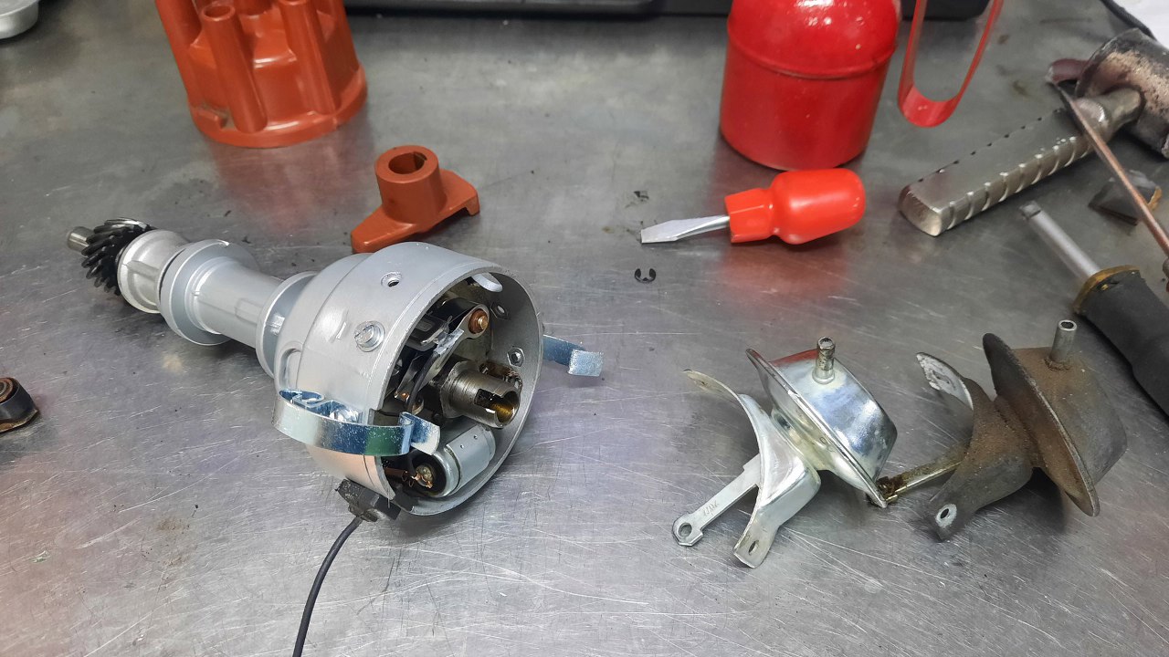 Odkręciłem co się dało, łącznie z puszką podciśnienia, kondensatorem i przerywaczem. Jestem bardzo zaskoczony, że Ford z 1984 roku ma jeszcze przerywaczowy układ zapłonowy. Na moje oko powinien już mieć układ z modułem zapłonowym, ale wygląda, że tak wyjechał z fabryki, więc tak ma być.