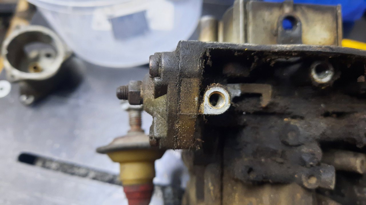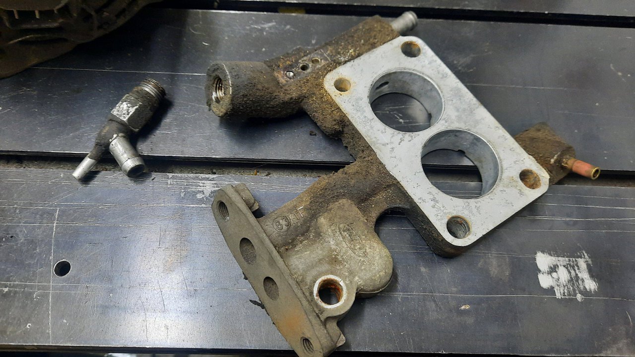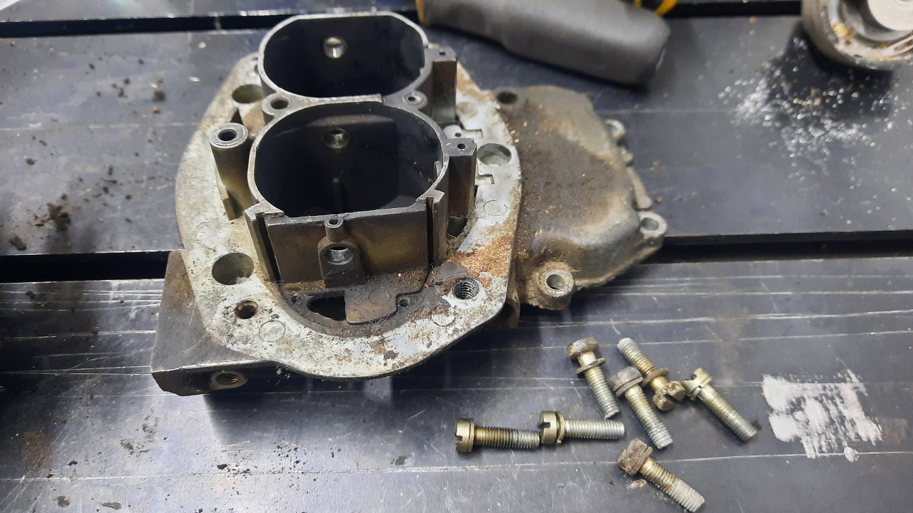 Następnym kawałkiem silnika, którym się zająłem, jest gaźnik. Oczywiście rozkręciłem go jeszcze z całą resztą silnika i osprzętu, sporo przed złożeniem chociażby skrzyni z poprzedniej strony, ale żeby zachować ciągłość historii, opiszę to teraz. Najpierw z podstawki pod gaźnik wykręciłem króciec, żeby samą podstawkę mieć gotową do czyszczenia.