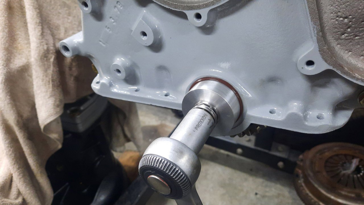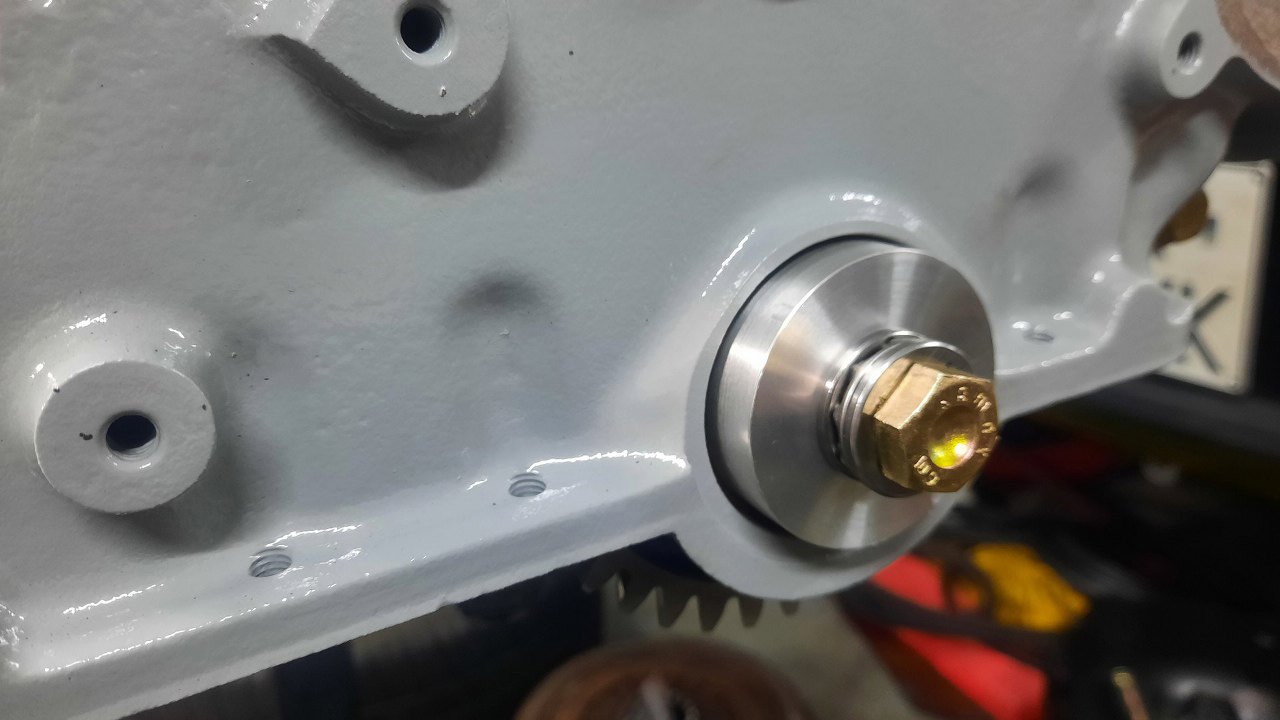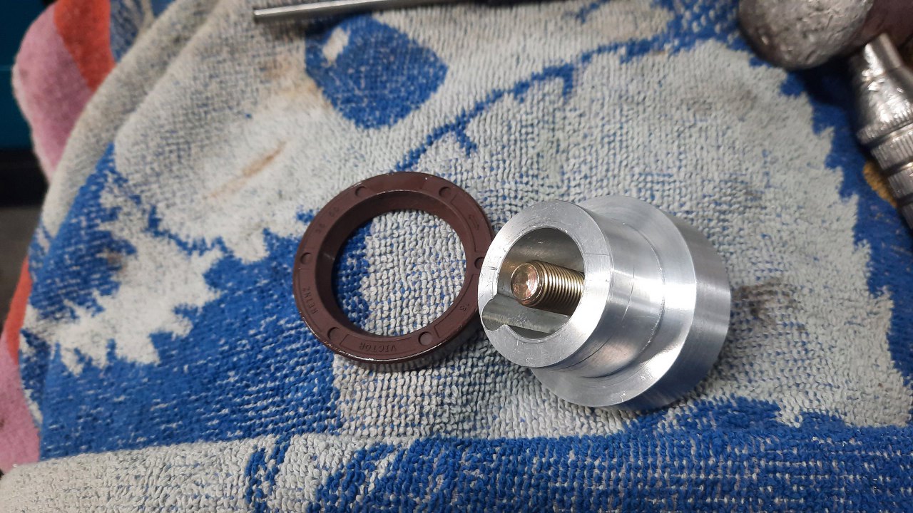 Przy okazji składania przodu tego silnika postanowiłem sobie wytoczyć przyrząd do wkładania uszczelniacza przedniej pokrywy. Ten uszczelniacz nie zatrzymuje się w pokrywie na żadnym progu, nie ustalany jest niczym. I jak się ma pokrywę luzem, to jeszcze można się bawić, ale jak by to chcieć wymienić na silniku, to robi się to trochę trudno. Powstało coś takiego.