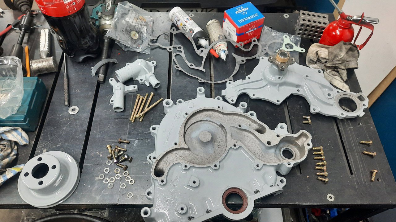 Przykręciłem nową pompę wody. Stara była w dobrym stanie, ale nie chcę ryzykować wycieku - czasami jak pompa nie jest używana, to po zalaniu płynem cieknie. Założyłem nowy termostat.