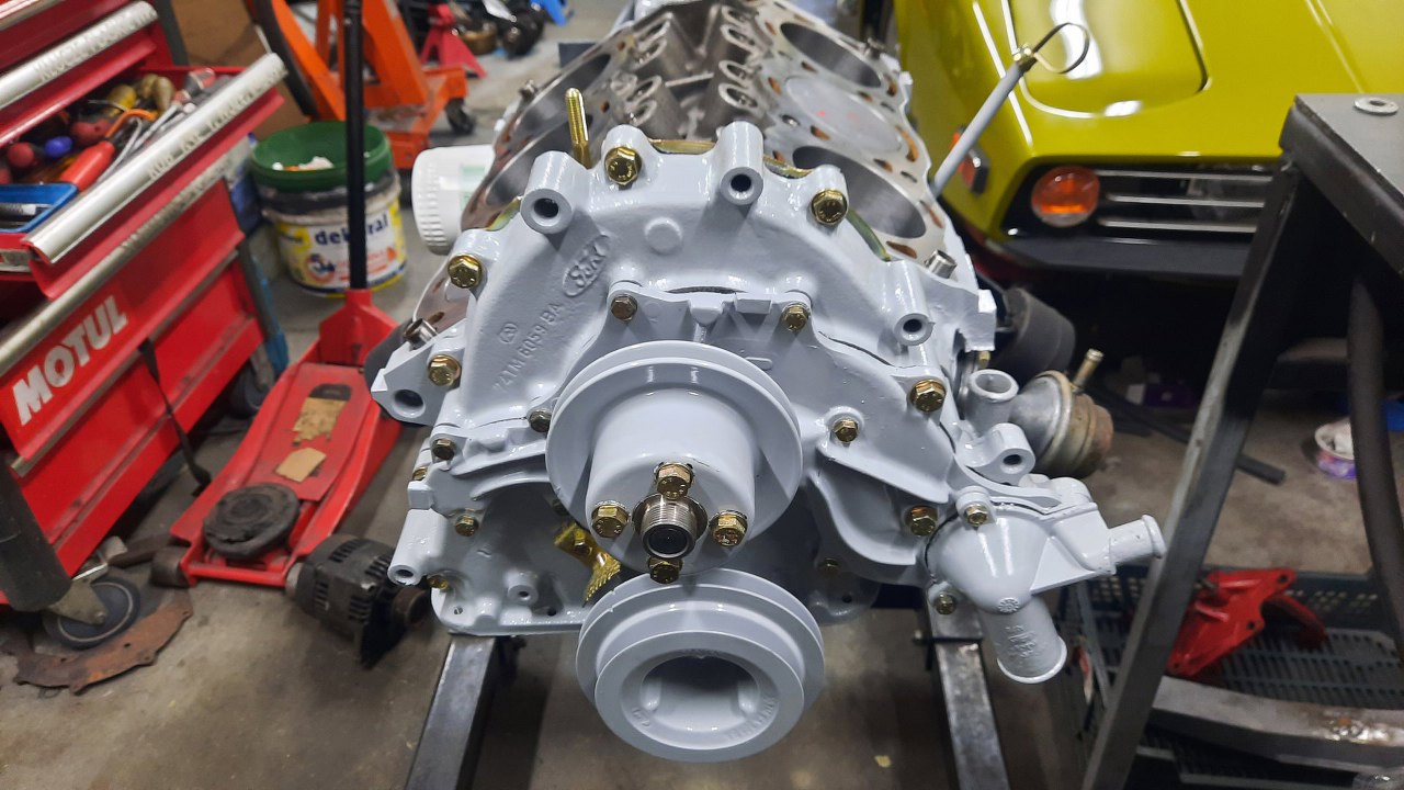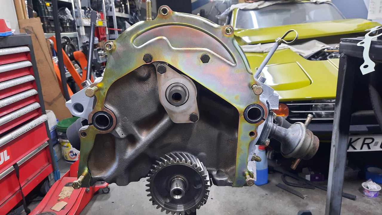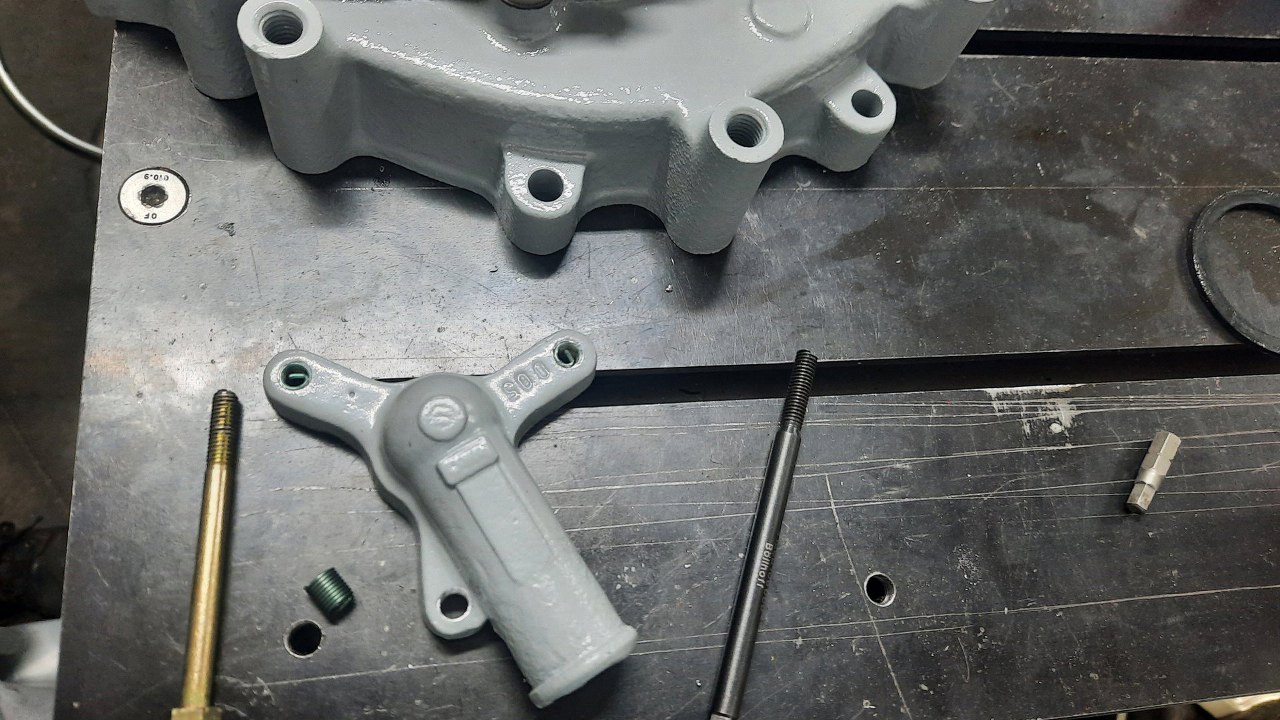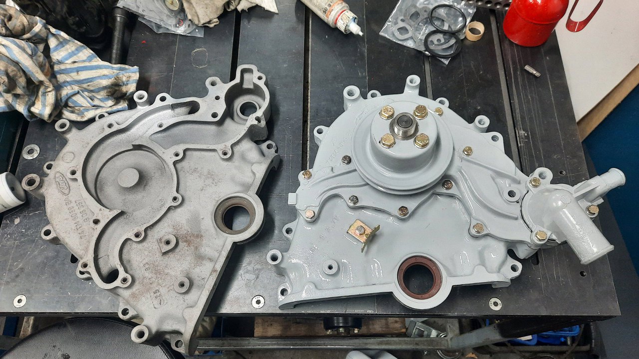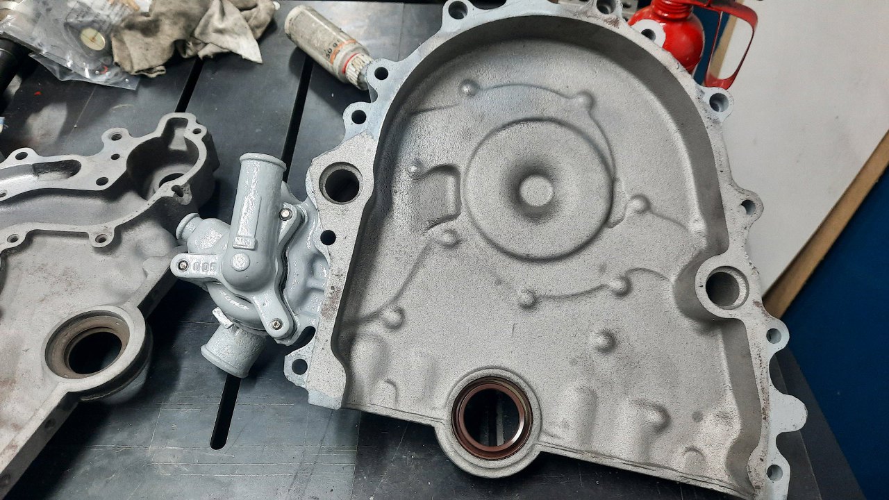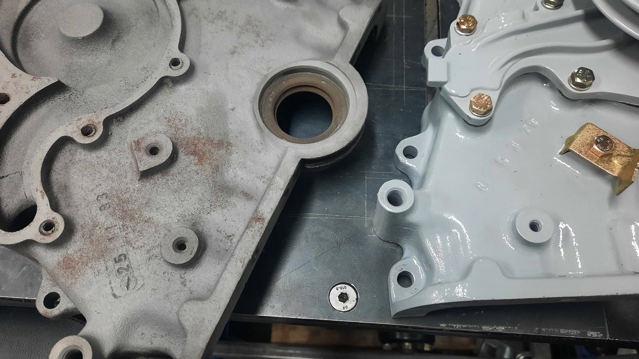 Nie jest to oryginalna pokrywa rozrządu z tego silnika. Ma datę produkcji z 79 roku, a oryginalna, po lewej, jest z listopada 1983r. Oryginalna jednak miała w jednym miejscu odłamany kawałek żeliwa i większość otworów na śruby od pompy wody tak pokiereszowaną, jak widać na zdjęciu. Ponieważ druga pokrywa była bez takich uszkodzeń, użyłem drugą.