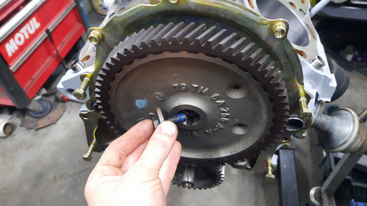 Potem dokręciłem śrubę z odpowiednim momentem. Na styku kół widać kropki do ustawienia ich we właciwej pozycji. Dolne koło ma jeszcze jedną kropkę (na mniej więcej godzinie 10-tej), jest to pozostałość po silnikach V4, które tam miały wałek wyrównoważający.