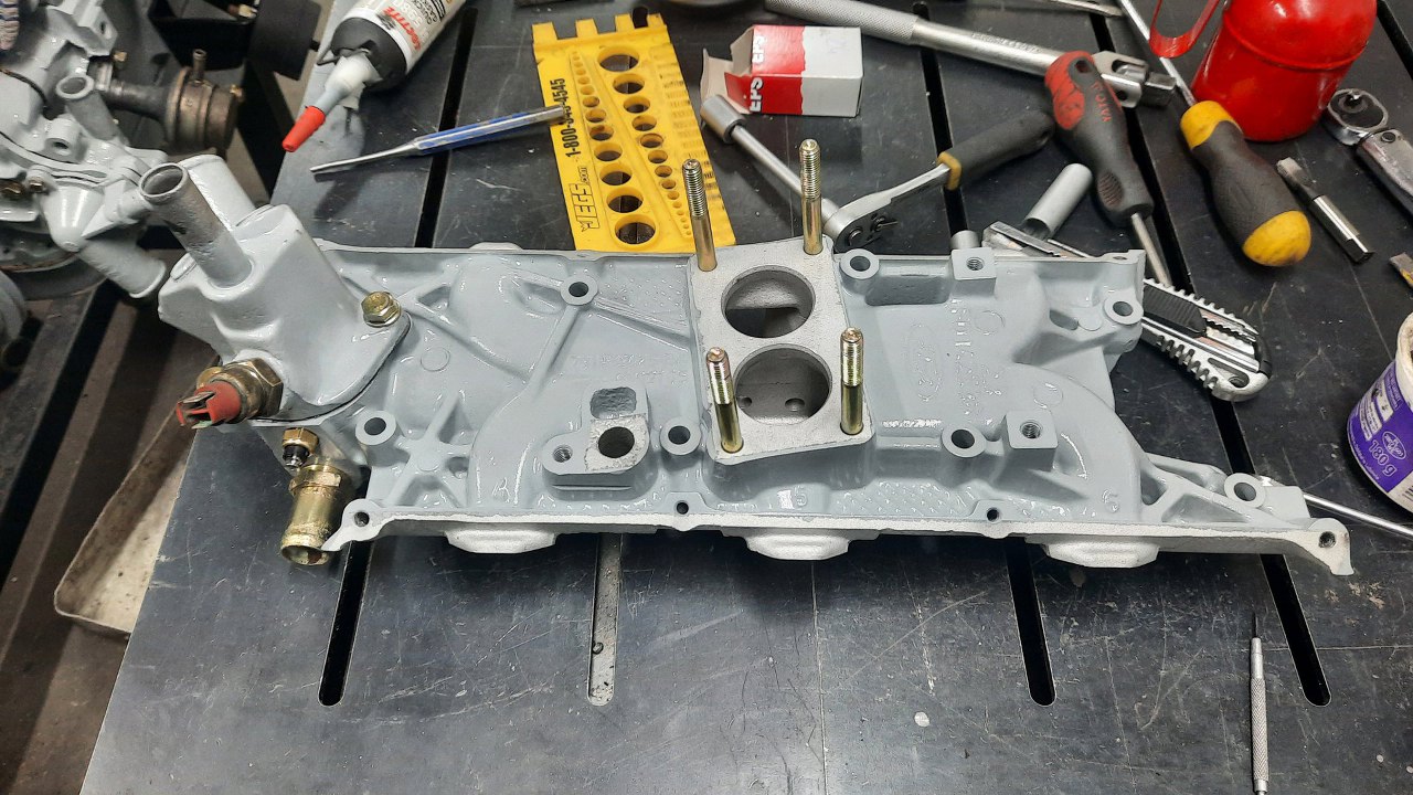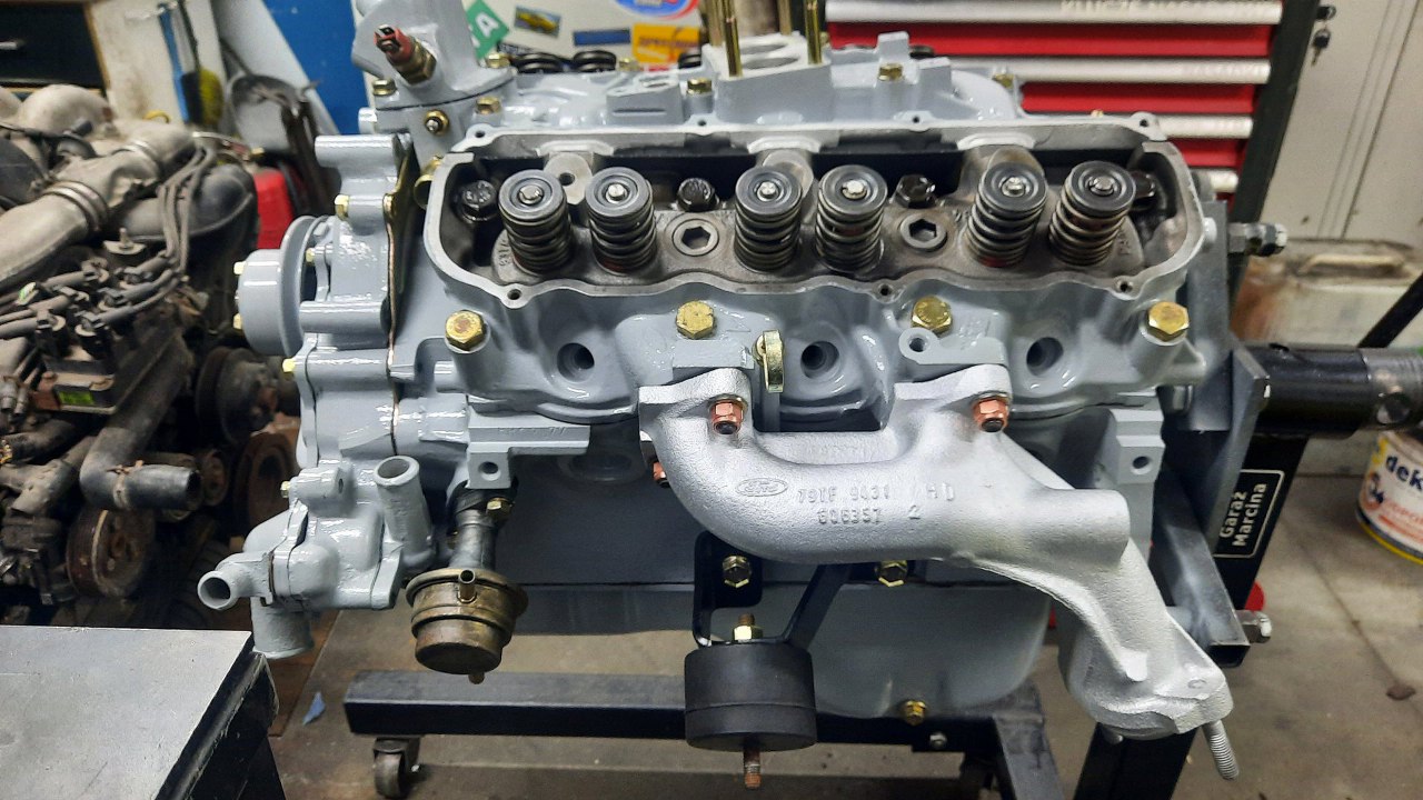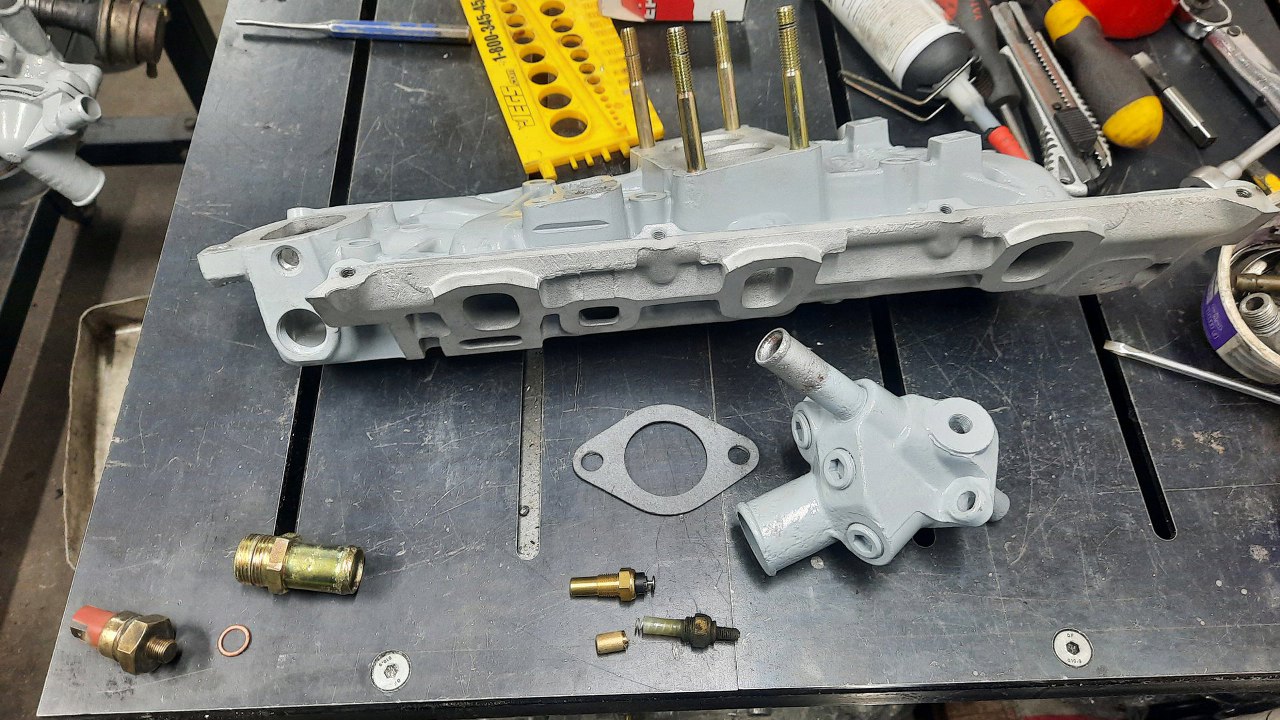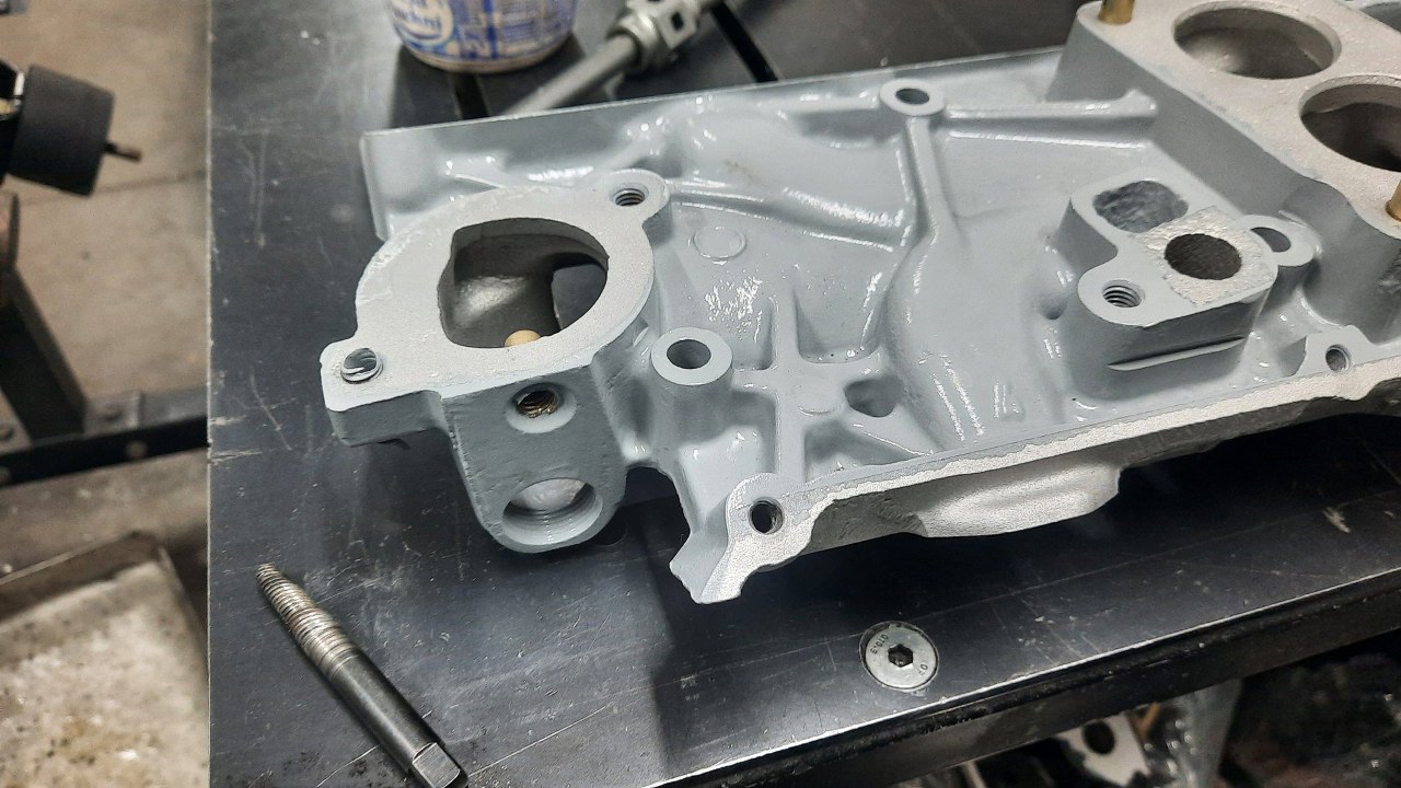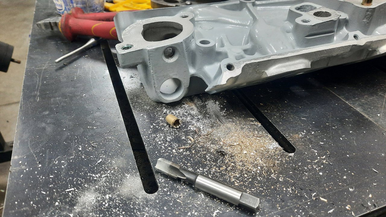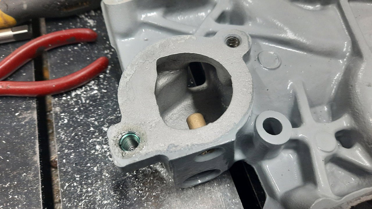 Następny do założenia czeka kolektor dolotowy, ale przy nim mam trochę rzeczy do zrobienia. Widać je na zdjęciu - urwana i wywiercona śruba pod pokrywkę górną i urwany czujnik temperatury płynu chłodzącego.