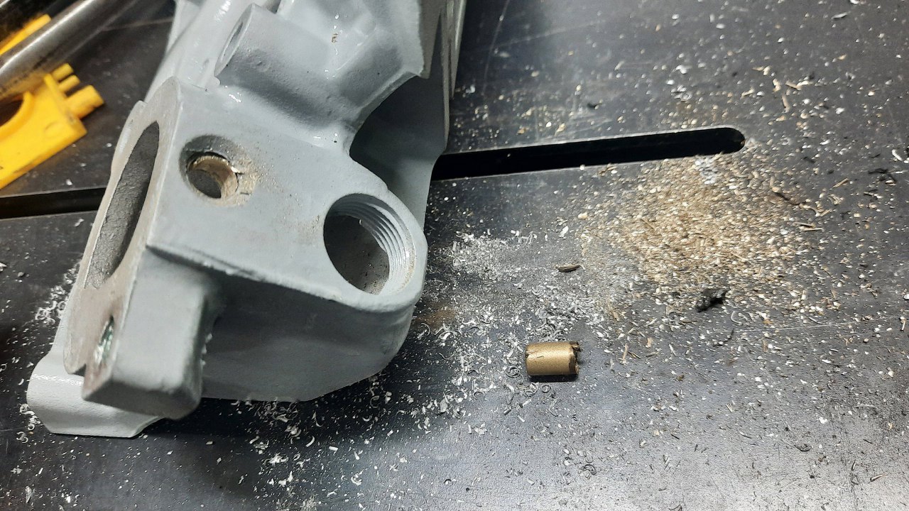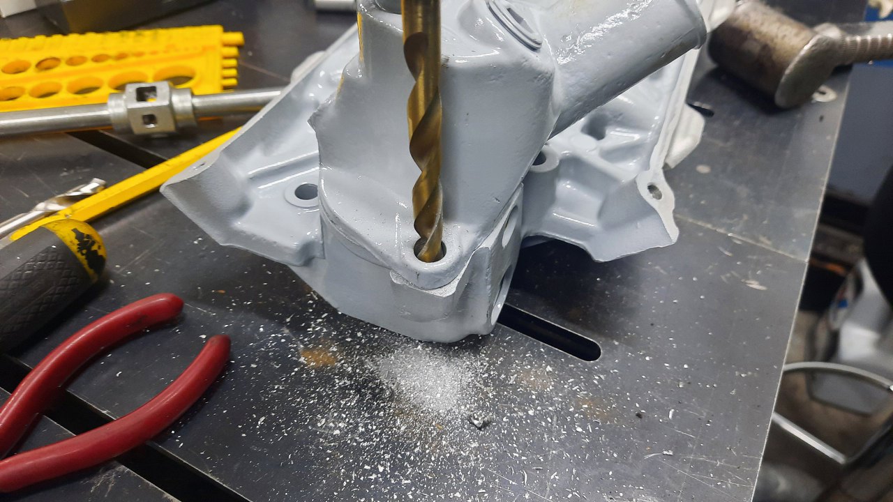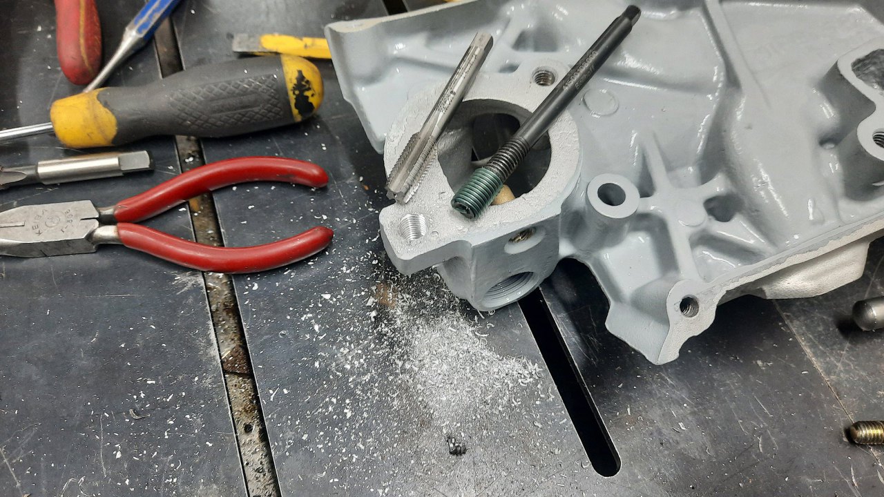 Po wywierceniu resztek śruby (co w aluminiowej części nigdy nie jest łatwe, bo wiertło chce uciekać w stronę miękkiego alu) nagwintowałem otwór i przygotowałem kolejnego helicoila.