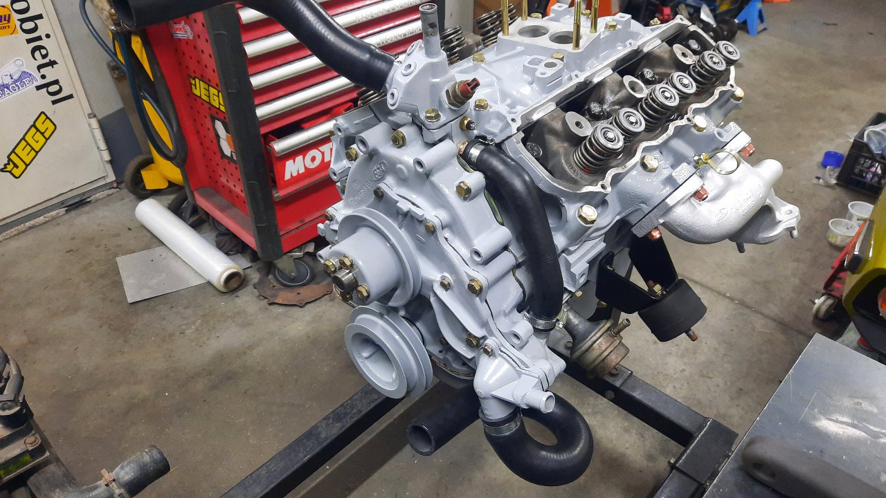Zacząłem też zakładać różne drobne części - rurkę bypassu pomiędzy tylną pokrywką termostatu a kolektorem dolotowym i rury do chłodnicy.