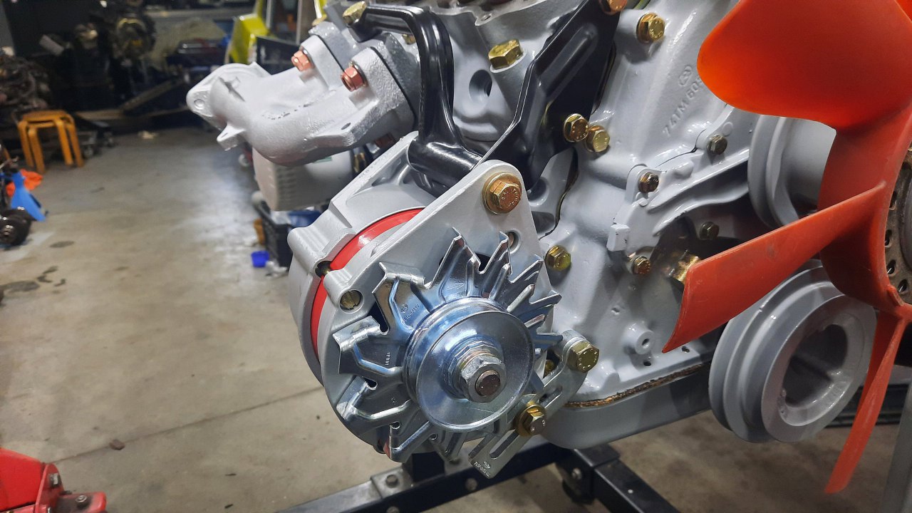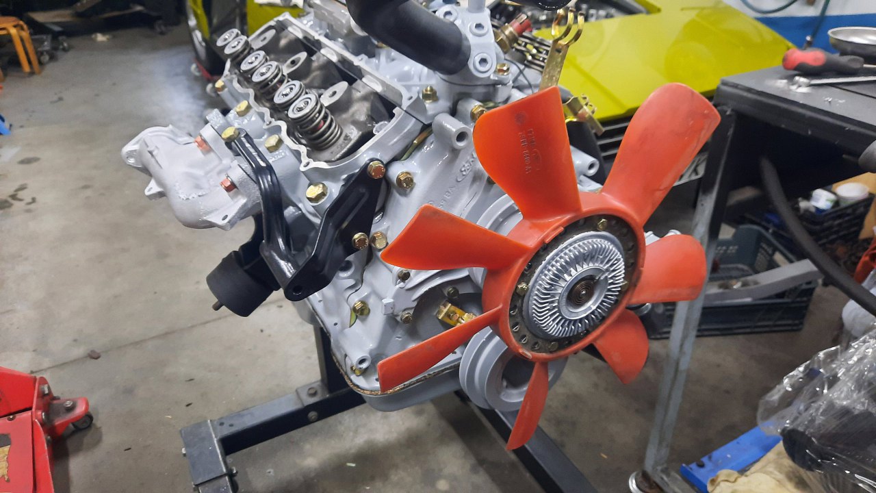 Z przodu prawej głowicy przykręciłem mocowanie alternatora. Domyłem też wiatrak chłodnicy i przykręciłem go z nowym sprzęgłem wiskotycznym do pompy wody.